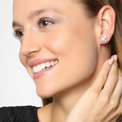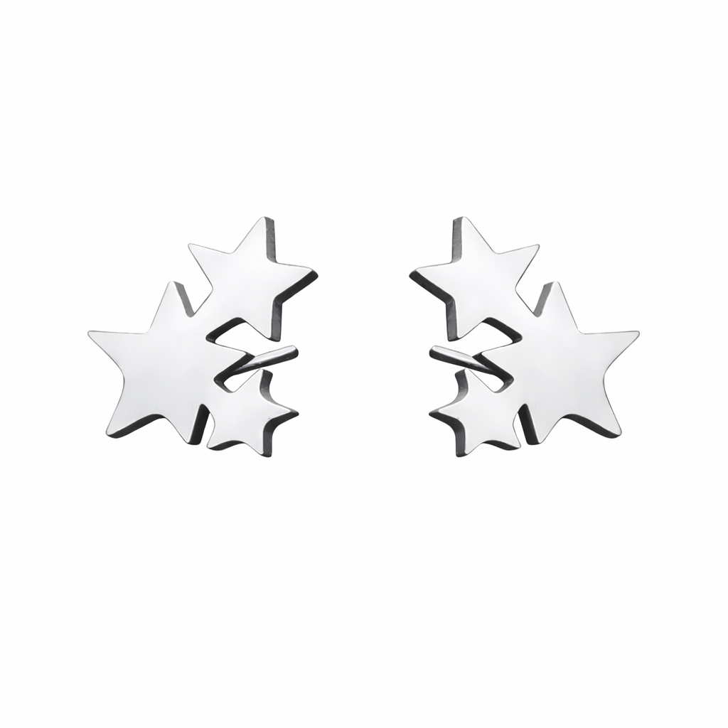 Aretes de acero inoxidable en tono plateado, diseño de estrellas.