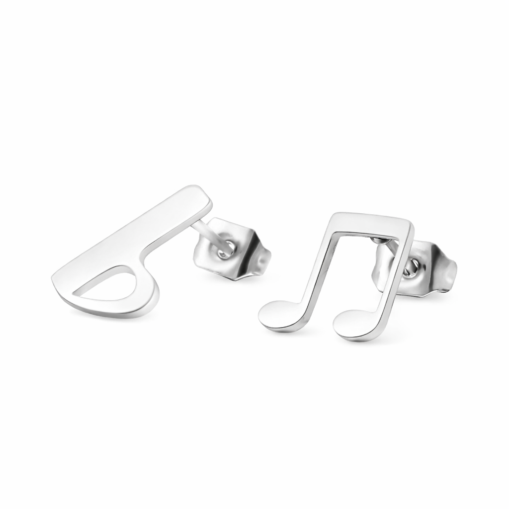 Aretes de acero inoxidable en tono blanco, diseño de nota musical.