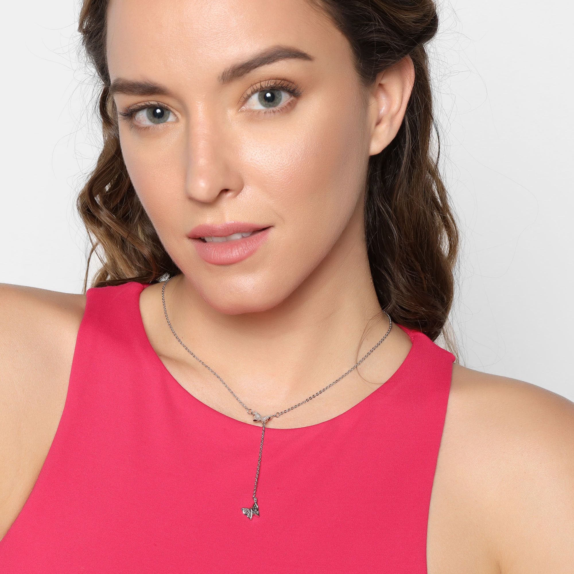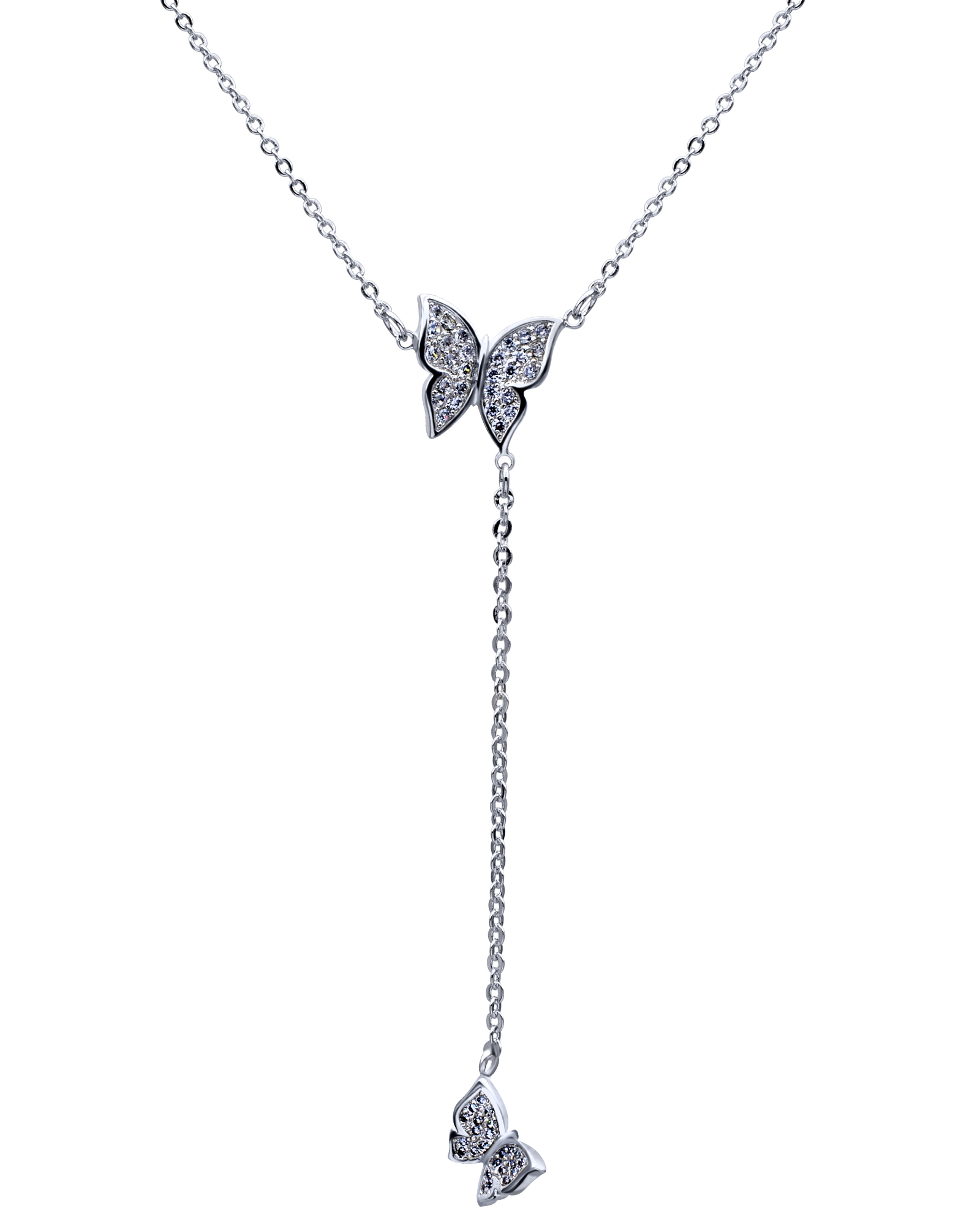 Fino collar en baño de oro blanco de 18 quilates, diseño de mariposas, con fina cadena colgante.