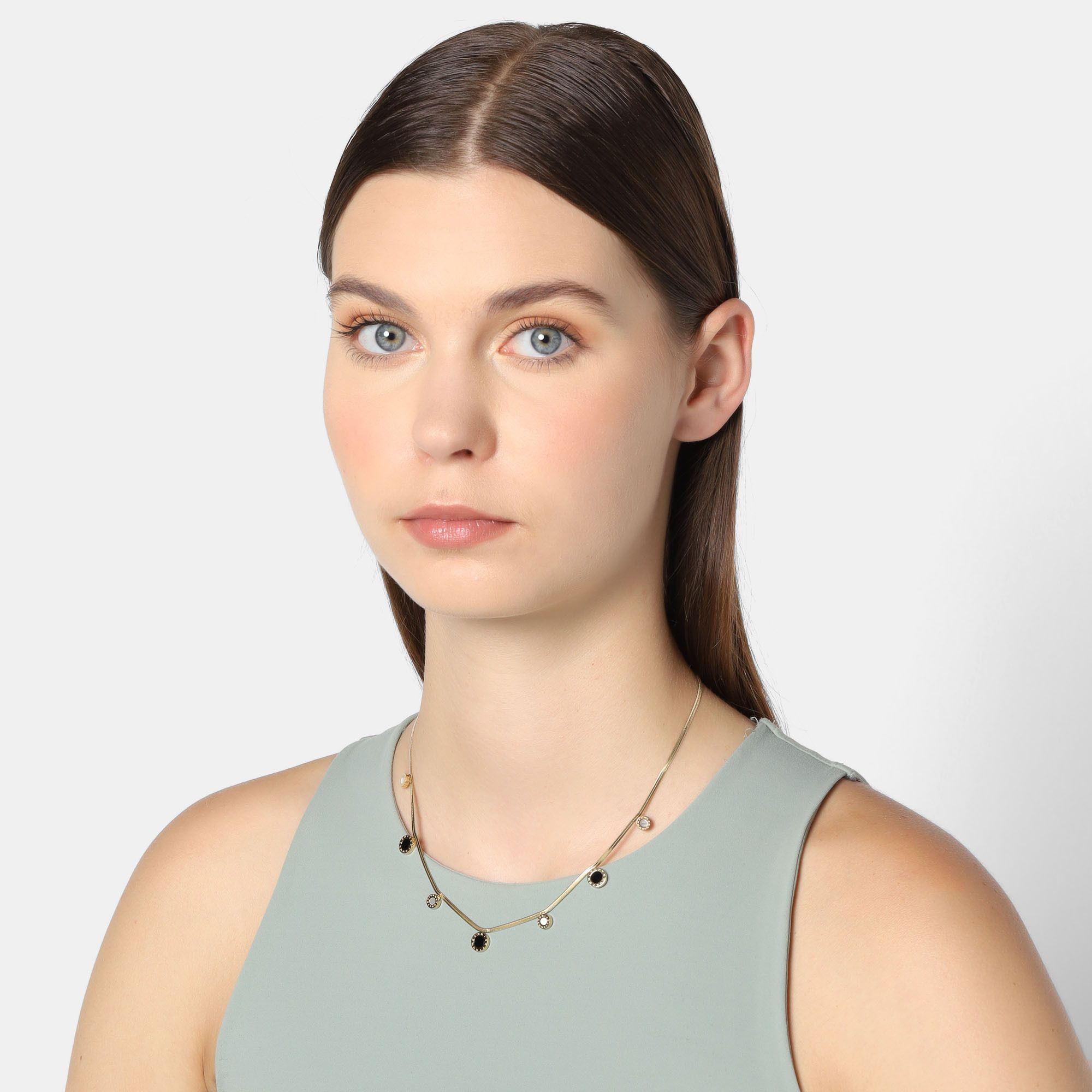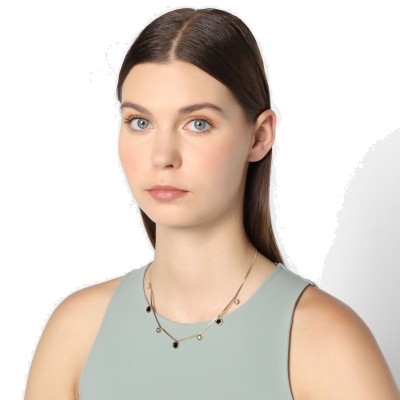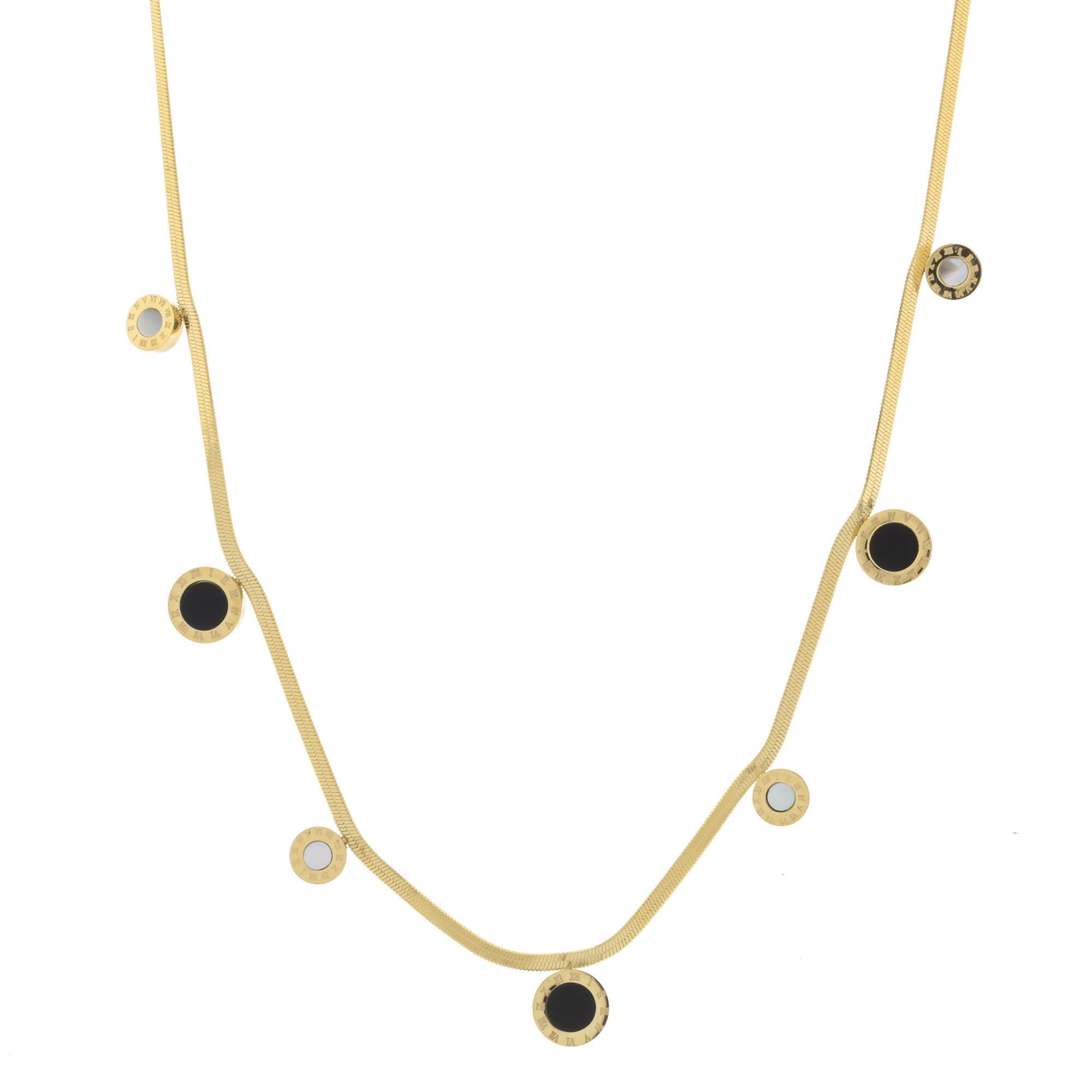 Precioso collar en acero de titanio color amarillo con pequeños círculos esmaltados en color negro y blanco y números romanos grabados.