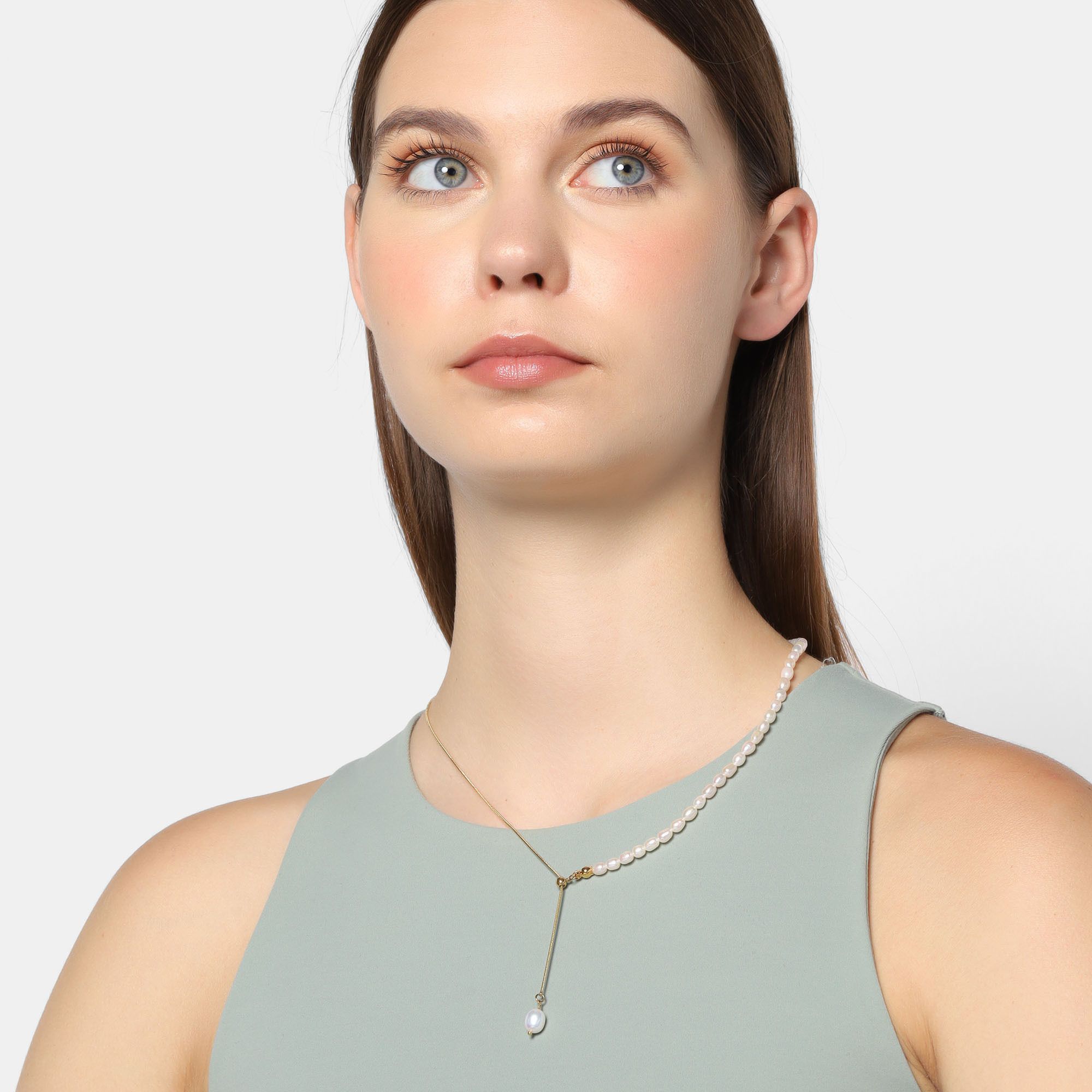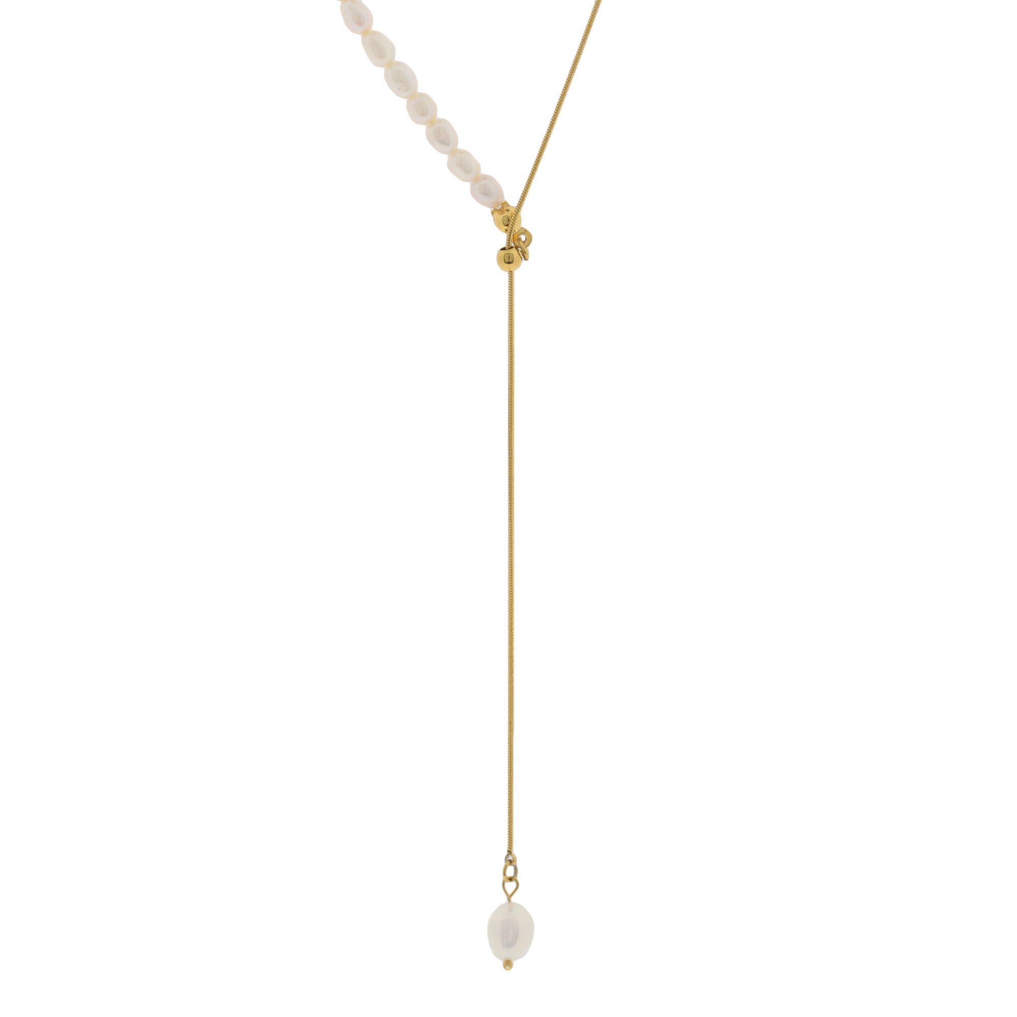 Fino collar en acero de titanio color amarillo, diseño con perlas blancas.