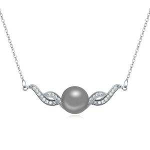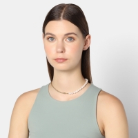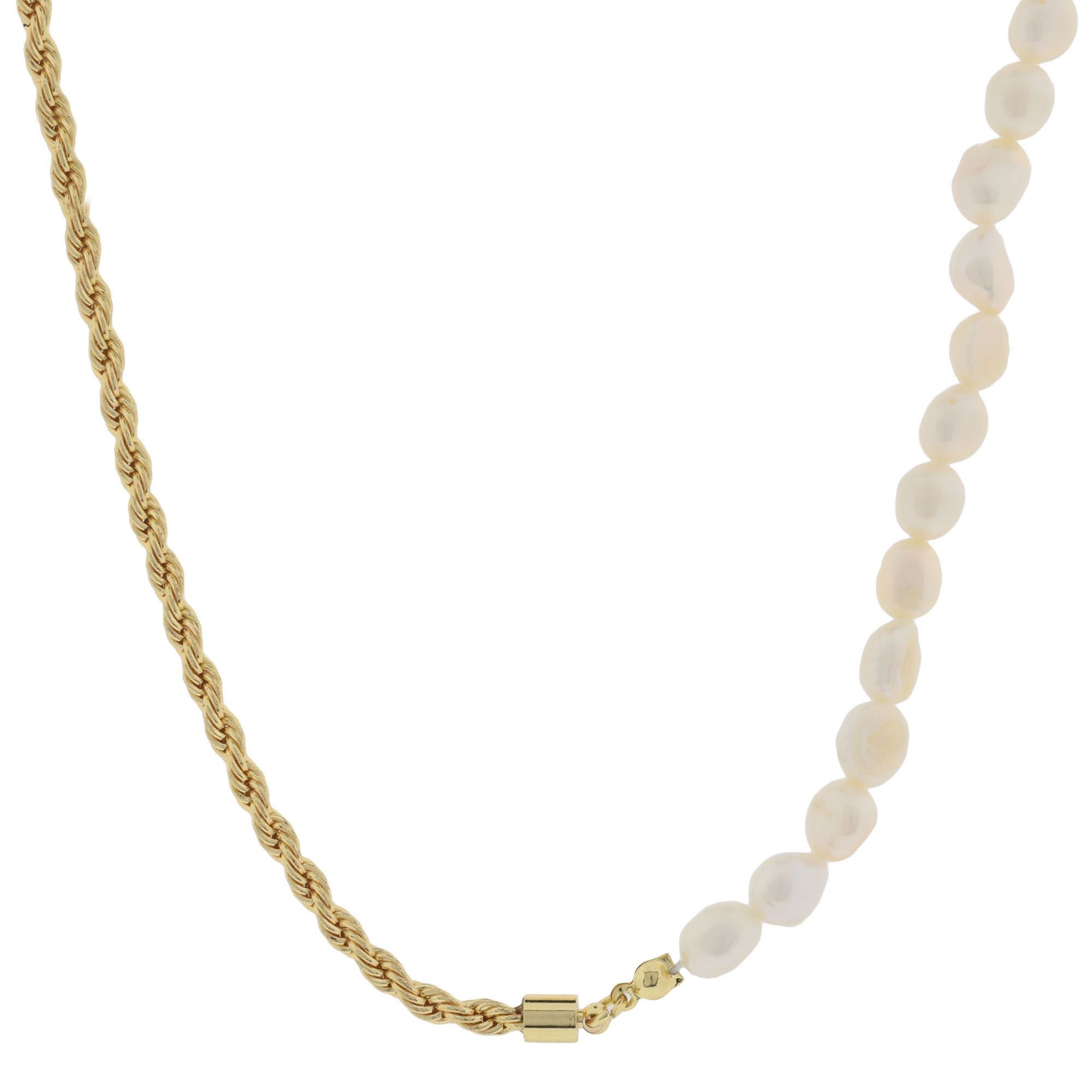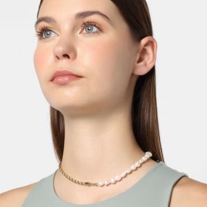 Fino collar en acero de titanio color amarillo diseño de caramelo en la cadena y detalle de perlas blancas.