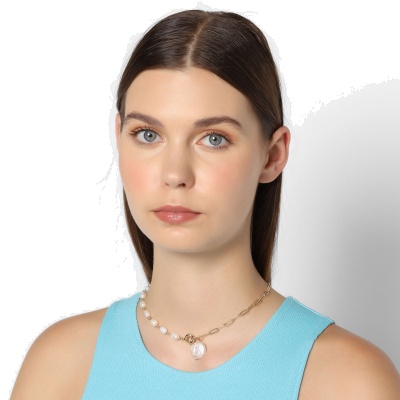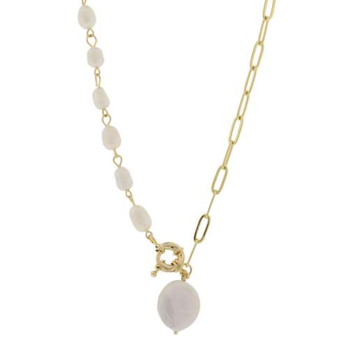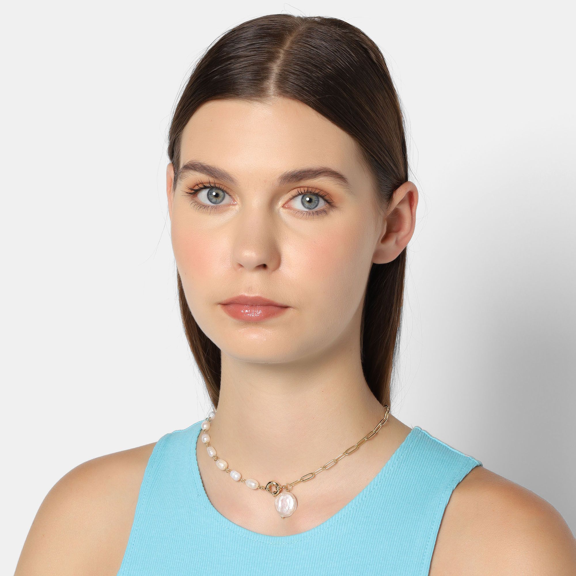 Lindo collar de acero de titanio diseño de eslabones con perlas blancas.