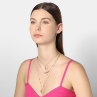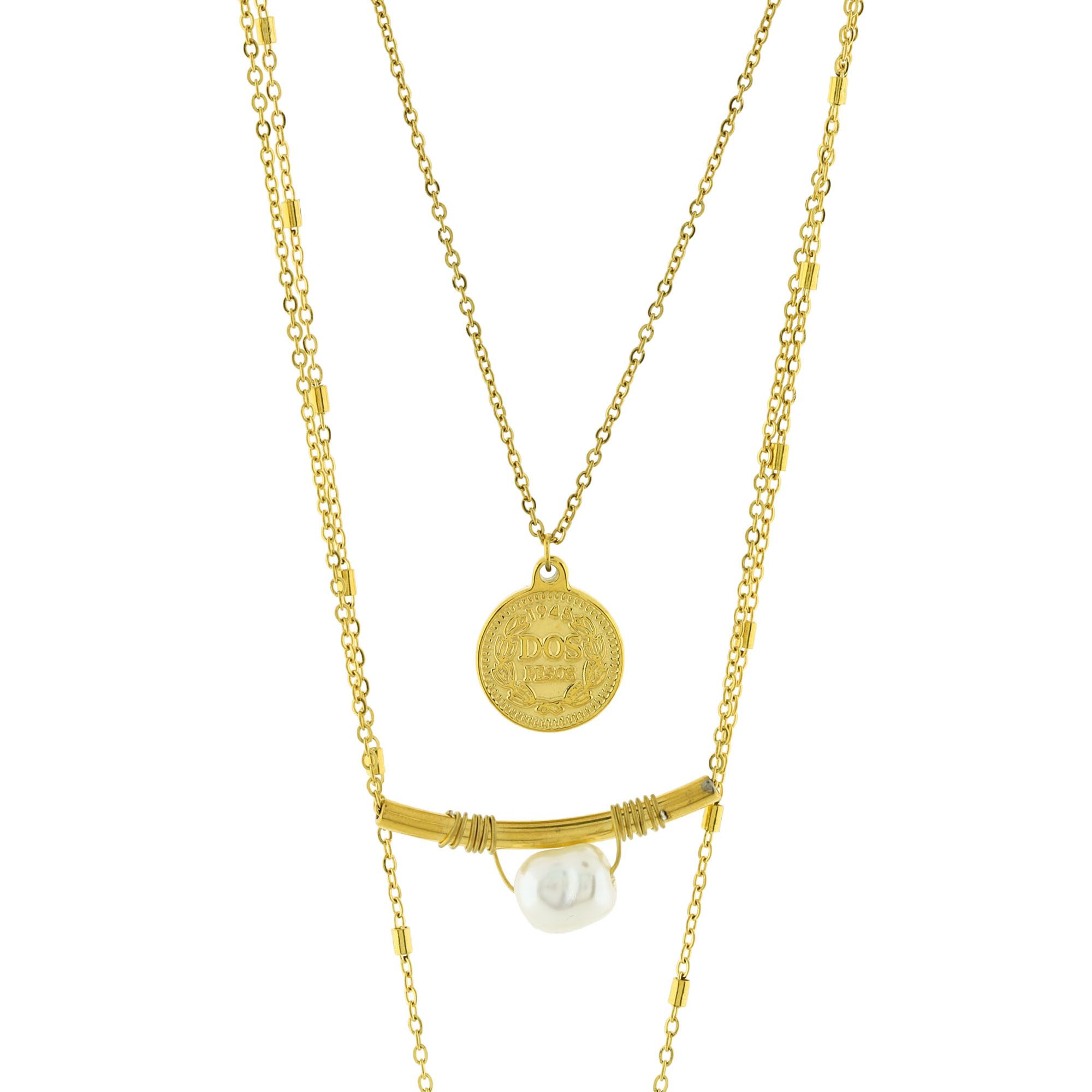 Delicado collar estilo doble en acero de titanio color amarillo con detalles de medallas y perla blanca.