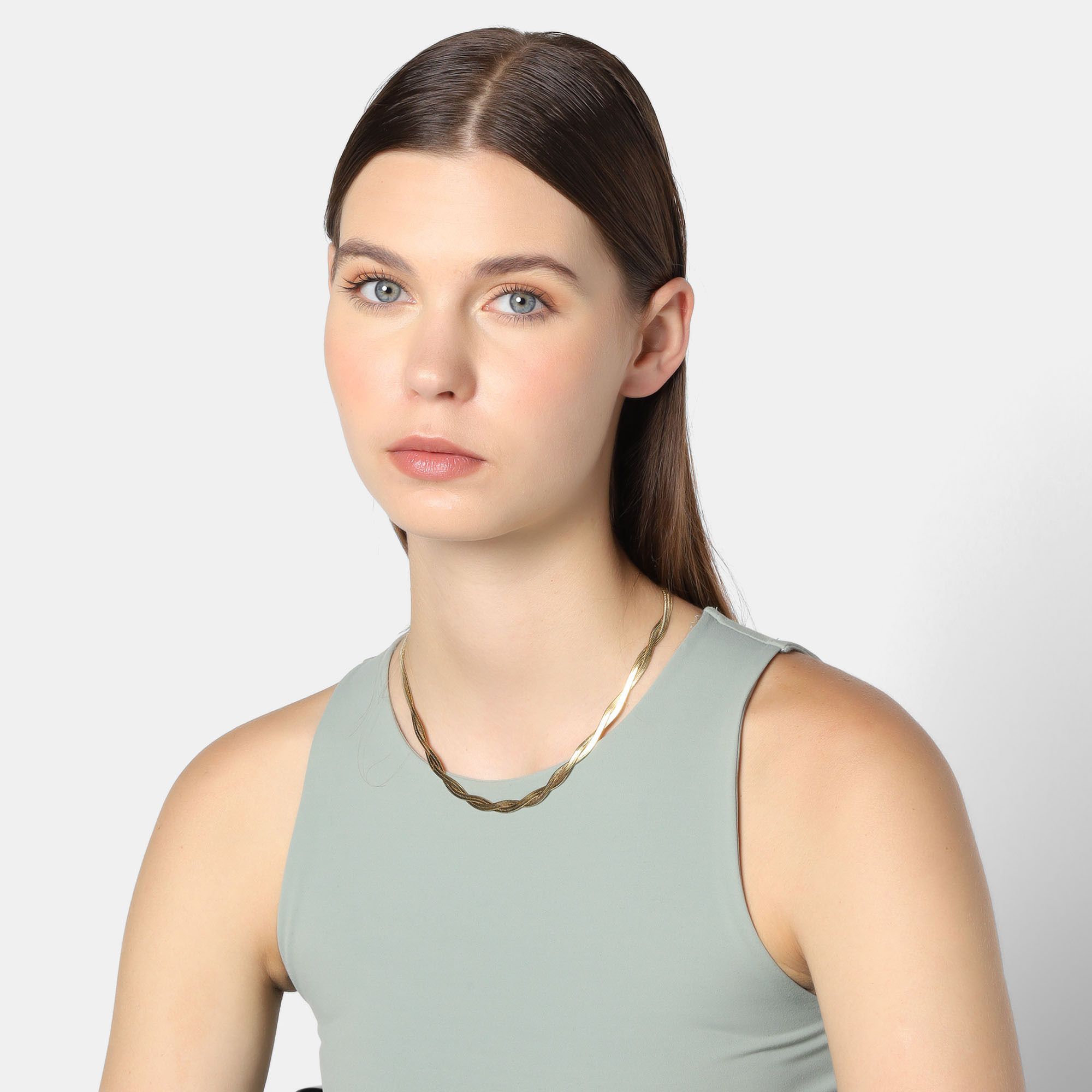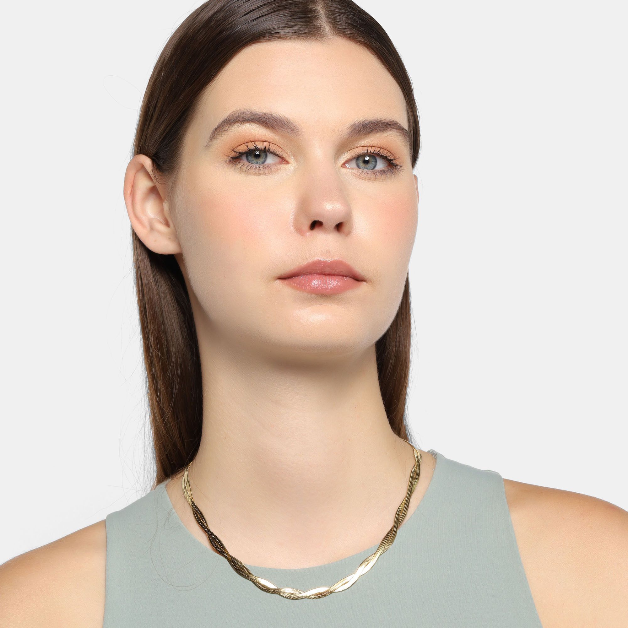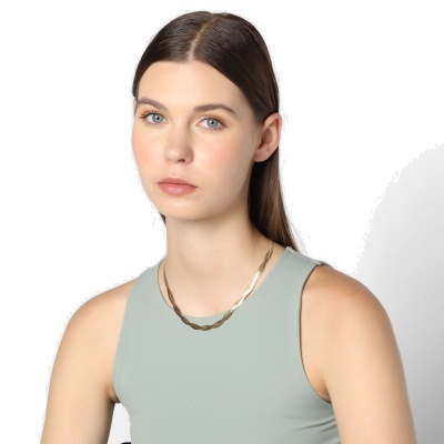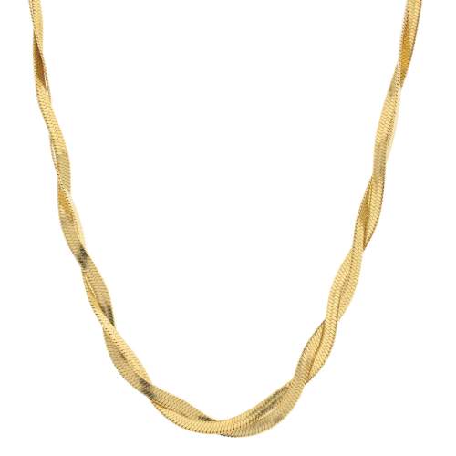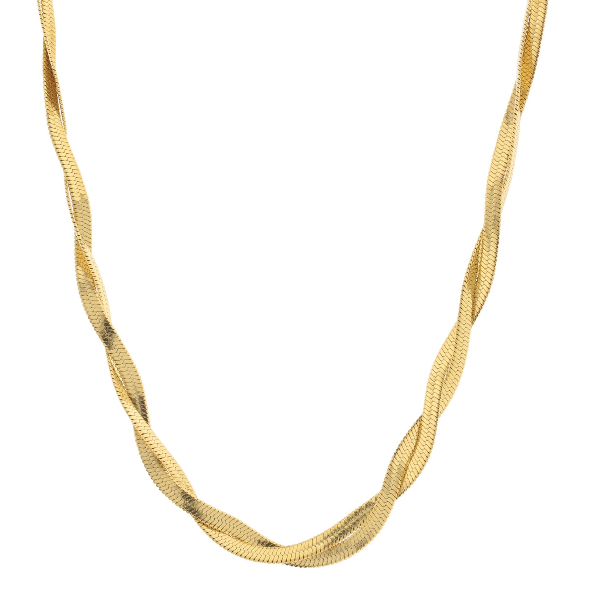 Hermoso collar estilo doble en acero inoxidable color amarillo, cadena planchada con diseño trenzado.