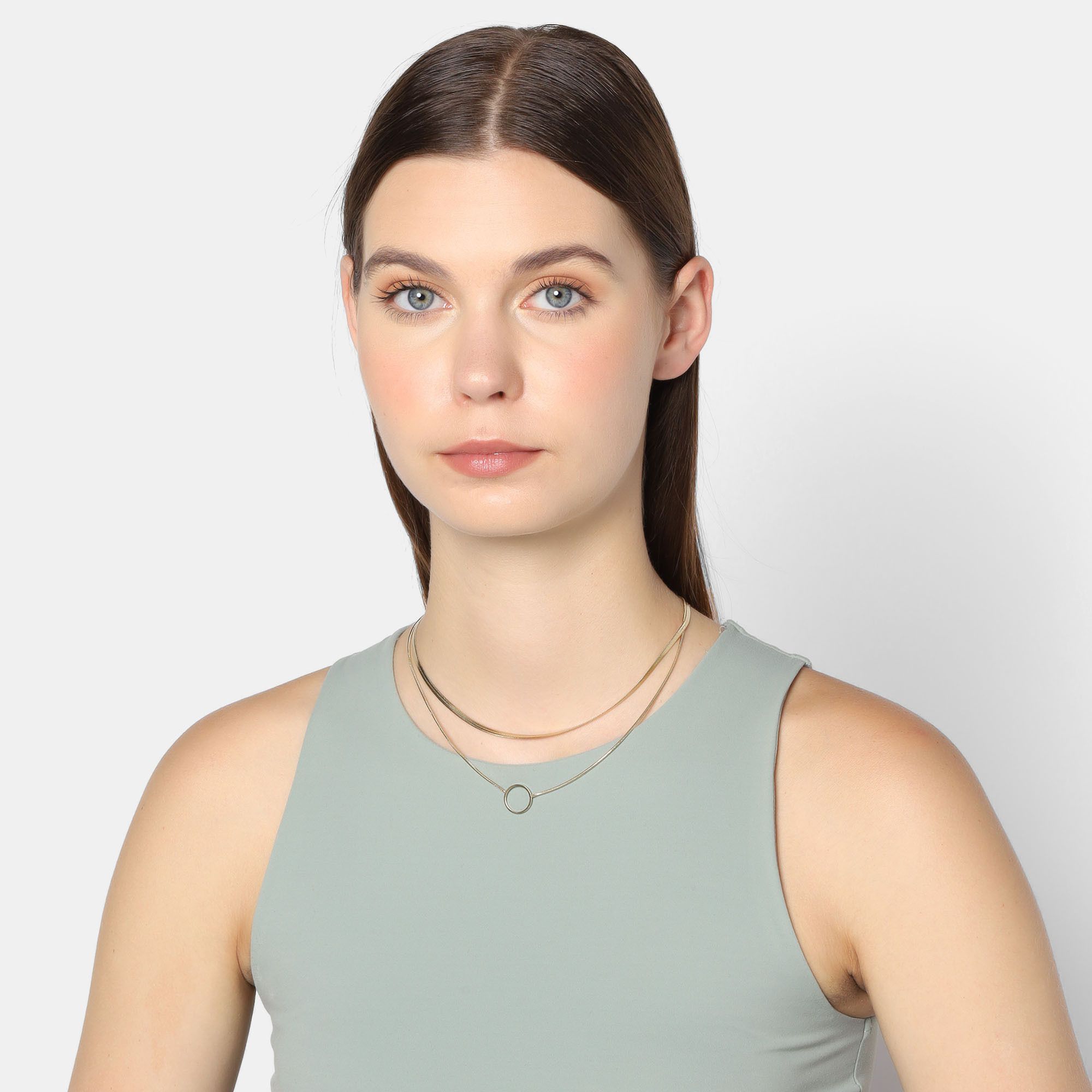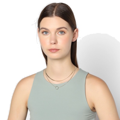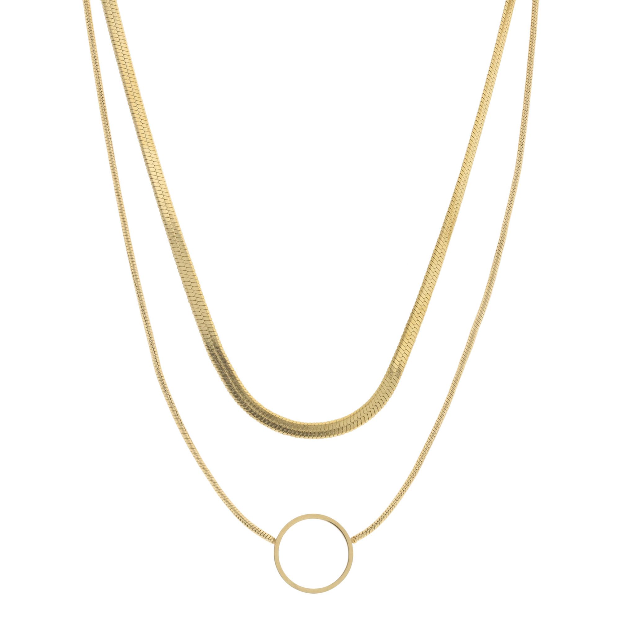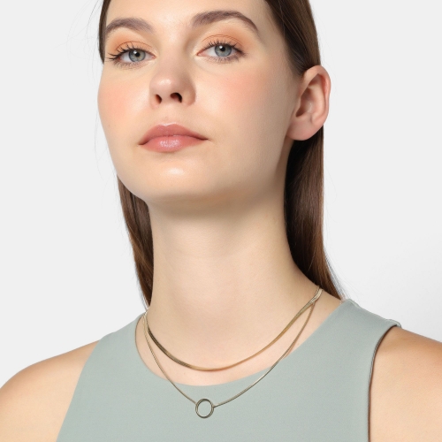 Fino collar en acero inoxidable color amarillo, estilo doble con cadena planchada y aro al centro.