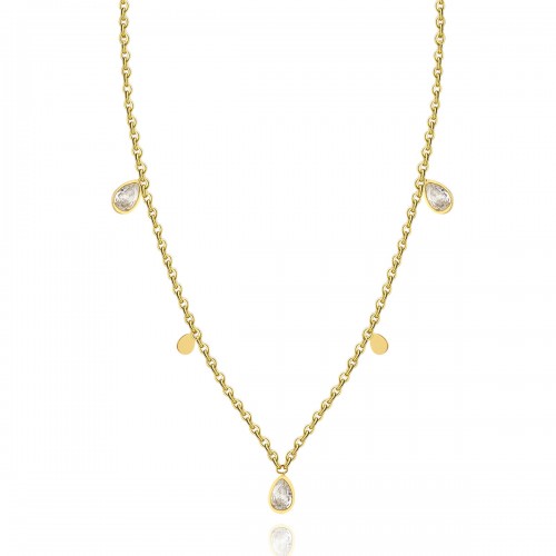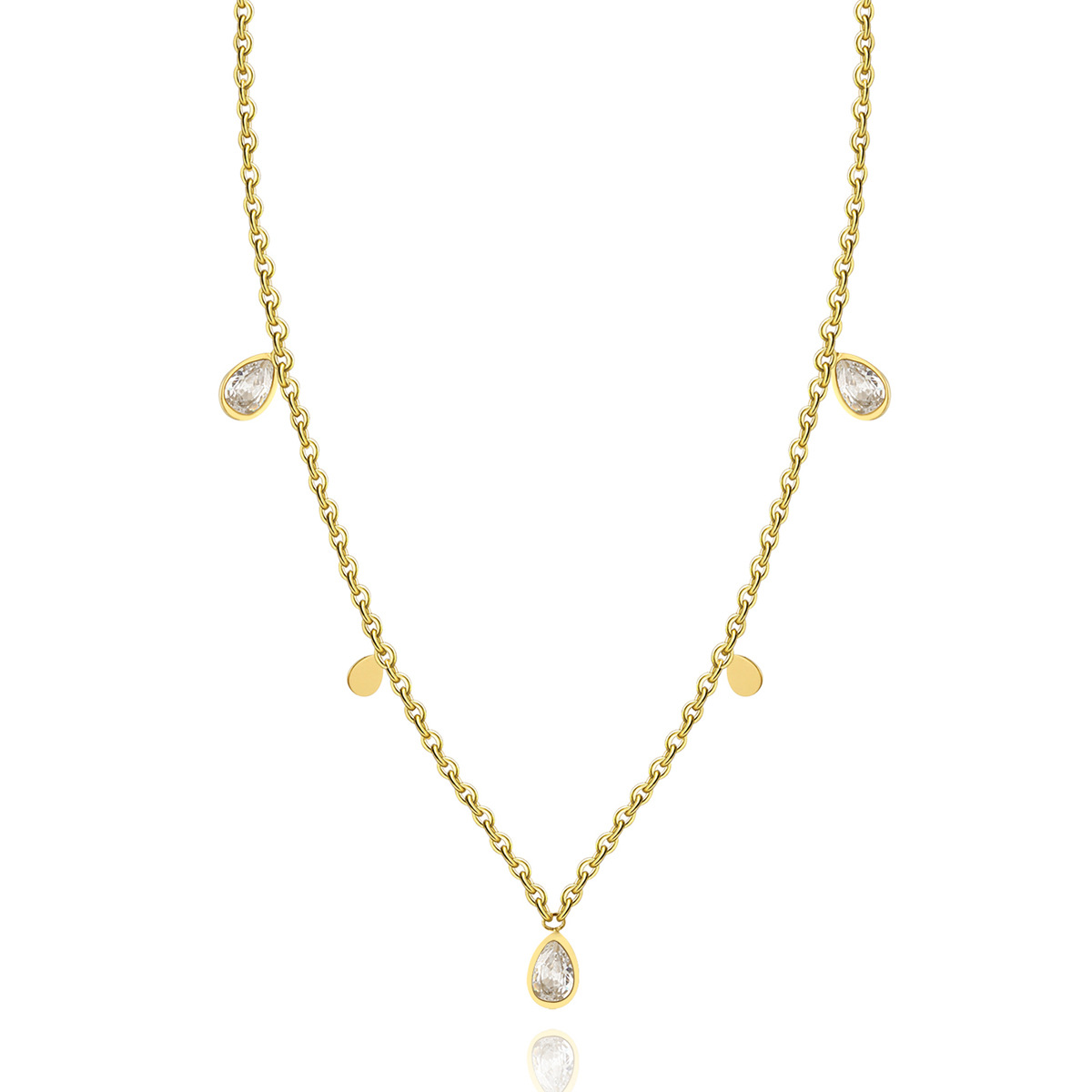 Elegante collar en baño de oro amarillo de 18 quilates, diseño de gotas con incrustaciones de cristales en color blanco.