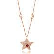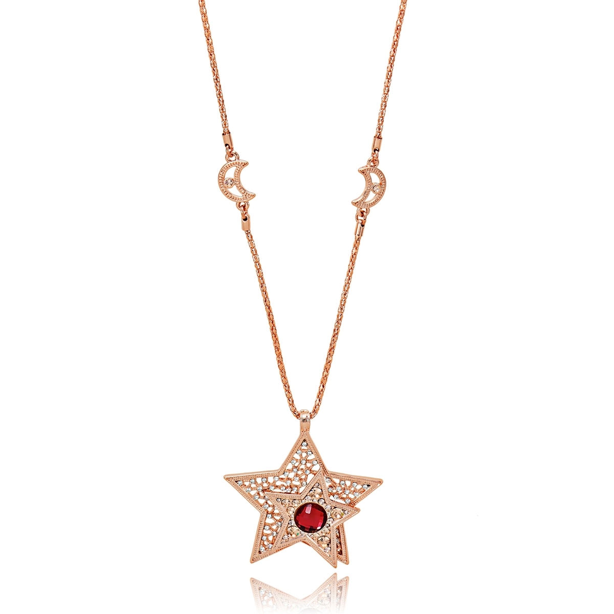 Bello collar en baño de oro rosa de 18 quilates, diseño de estrellas y lunas, con cristal rojo facetado corte redondo, e incrustaciones de cristales color ámbar y blanco.