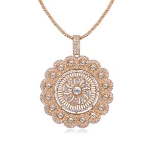 Bello collar en baño de oro rosa de 18 quilates, diseño de estrellas y lunas, con cristal rojo facetado corte redondo, e incrustaciones de cristales color ámbar y blanco.