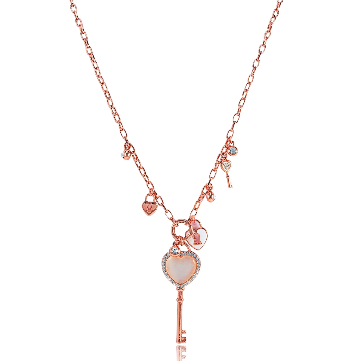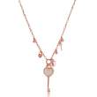 Dije y cadena en baño de oro rosa de 18 quilates, diseño de llave en forma de corazón, con cristal bohemia color blanco, pequeños charms de llaves y candados e incrustaciones de cristales blancos.