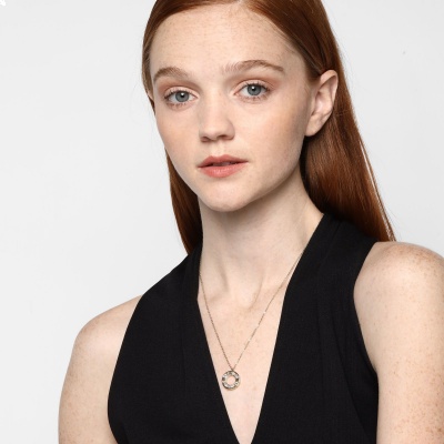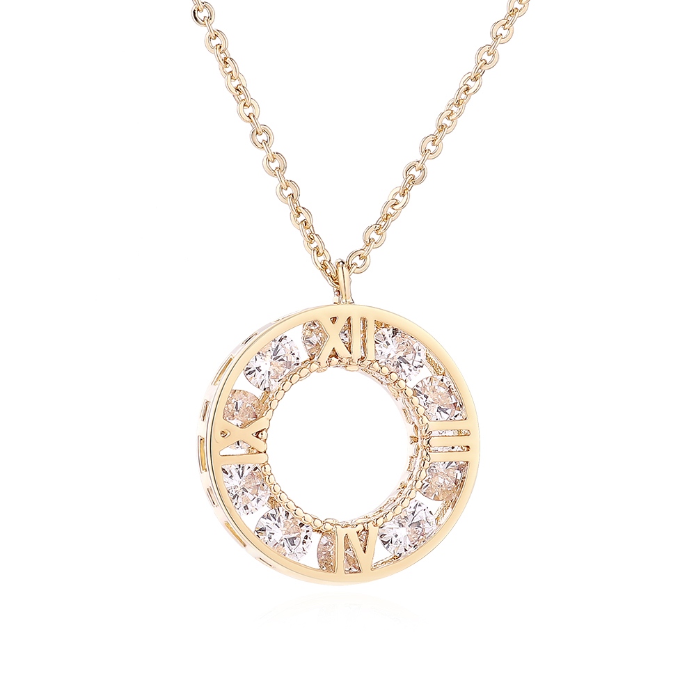 Exquisito dije con cadena en baño de oro amarillo de 18 quilates, diseño de aro, con números romanos en relieve e incrustaciones de cristales blancos.