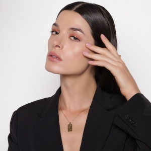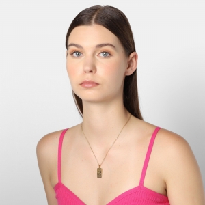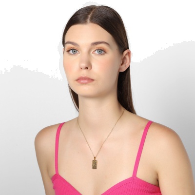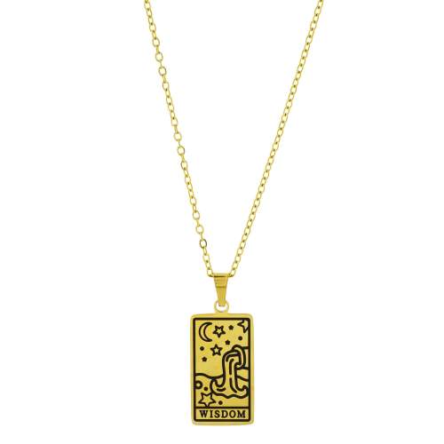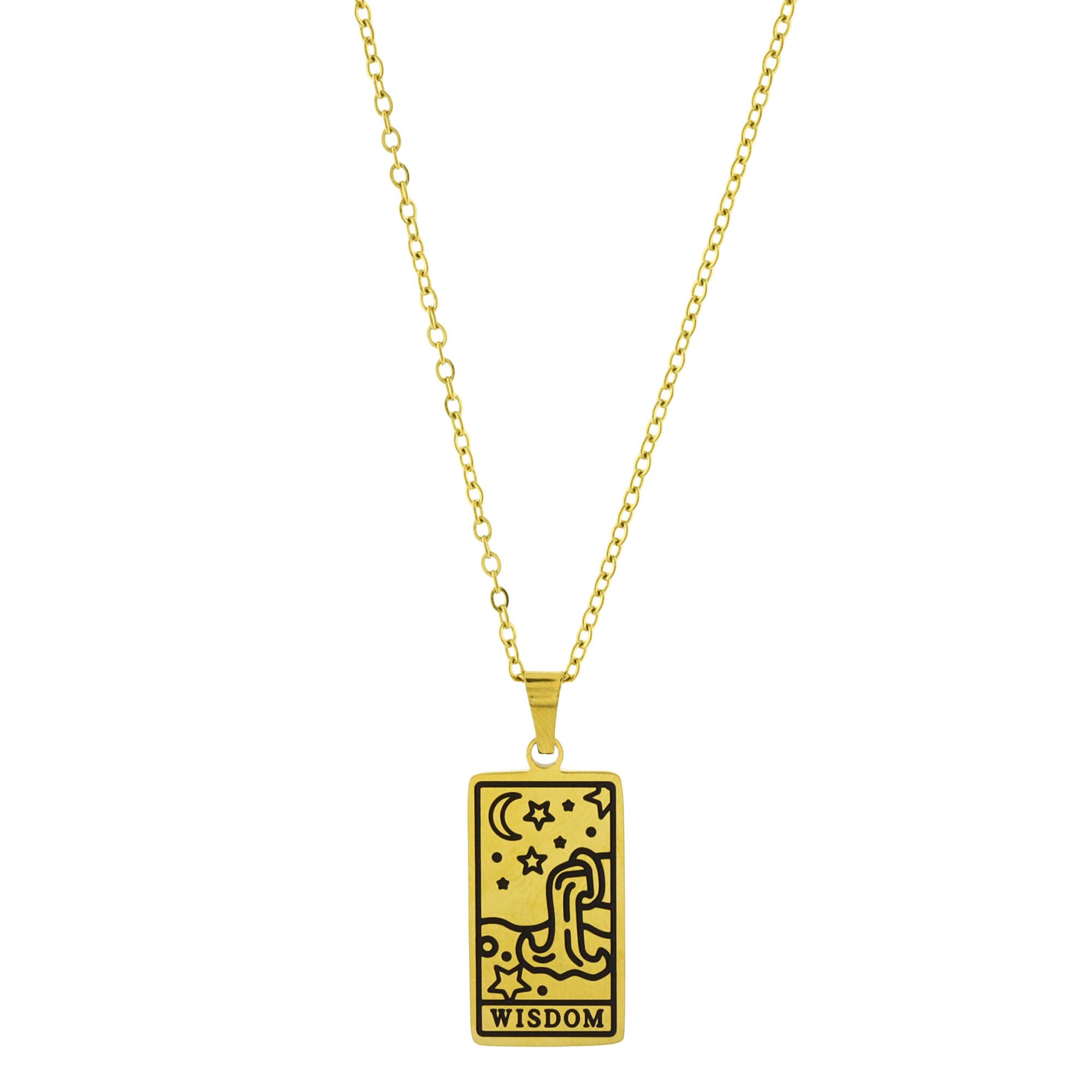 Dije con cadena en acero de titanio color amarillo, diseño de carta de tarot con figuras de jarrón, agua, luna, estrellas y palabra "WISDOM" grabada.