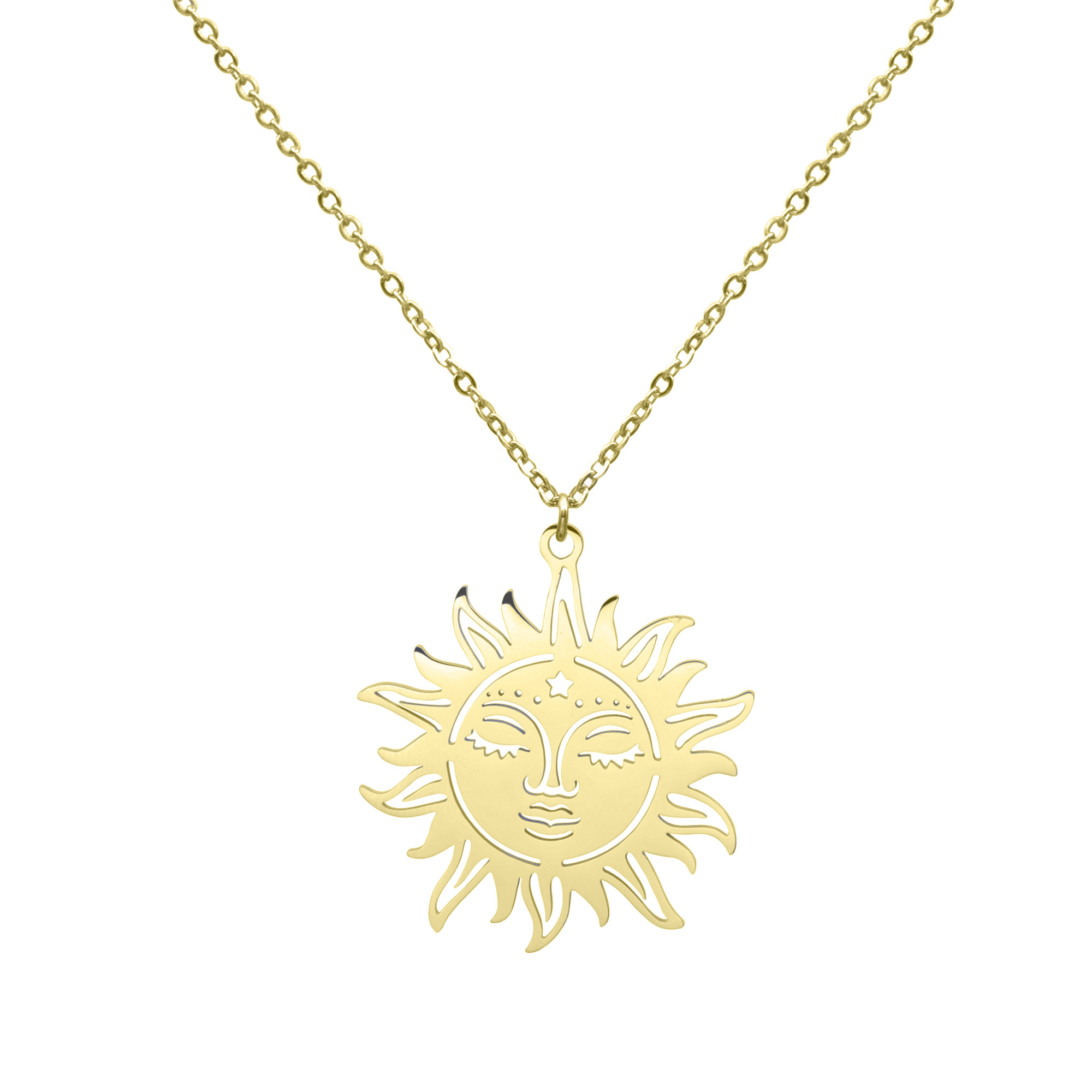 Dije de acero inoxidable en tono amarillo, diseño de sol.