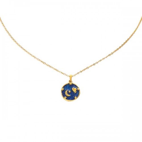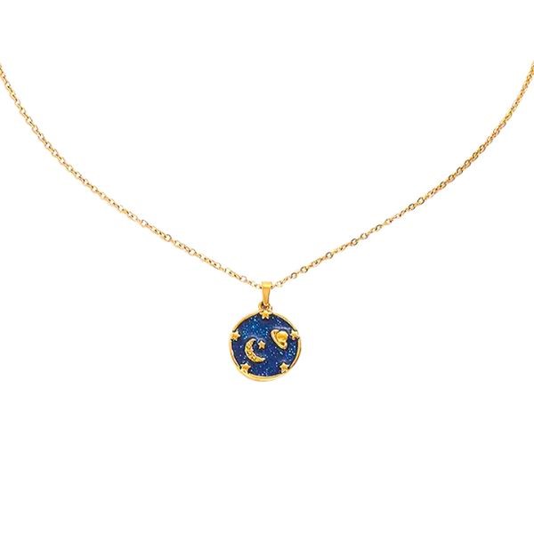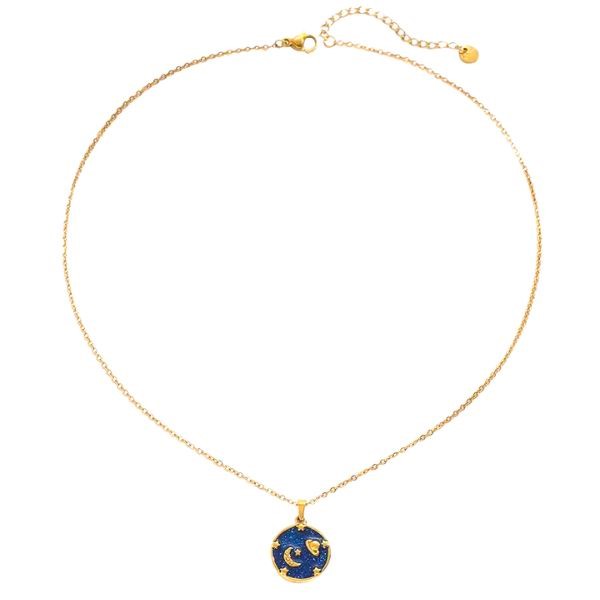 Dije con cadena en baño de oro amarillo de 18 quilates, diseño de planeta y luna con esmaltado azul.