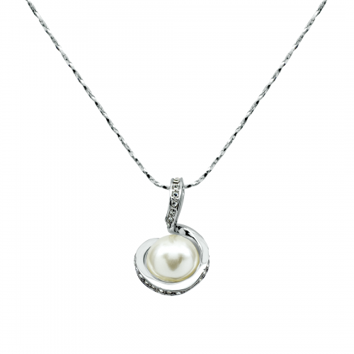 Dije con cadena en baño de oro blanco de 18 quilates, fino diseño de espiral con detalle de perla blanca e incrustaciones de cristales en color blanco. Fabricado en una estructura de aleación de platino con rodio sin níquel.