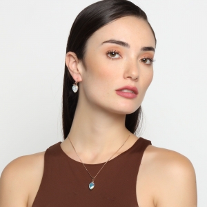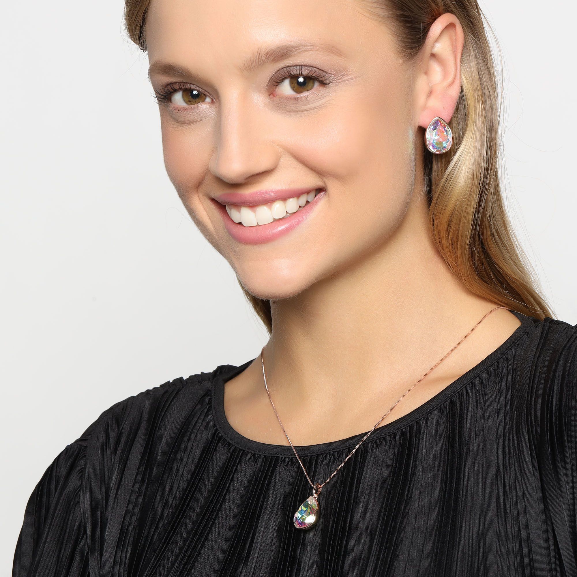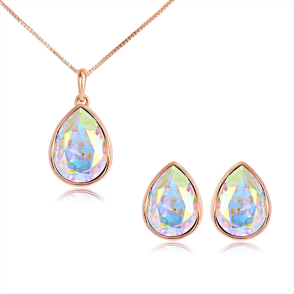 Bello conjunto de dije con cadena y aretes en baño de oro rosa de 18 quilates, diseño de gota caladas con cristales tornasol corte pera.
