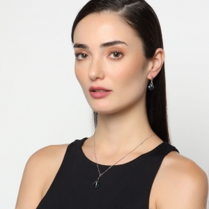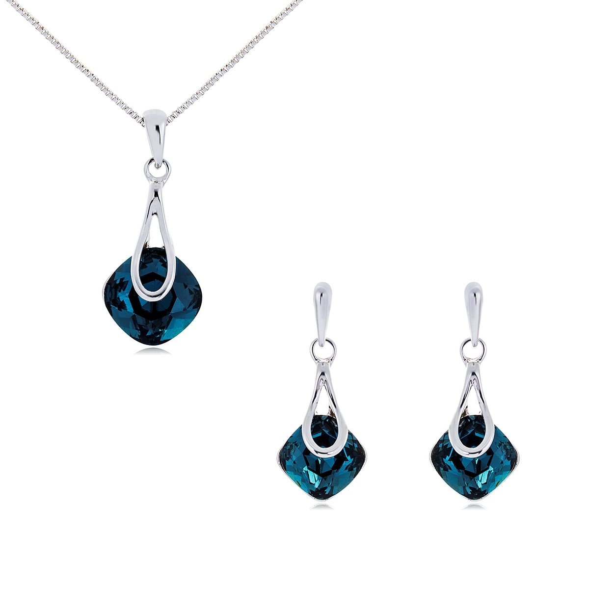 Bonito conjunto de dije con cadena y aretes en baño de oro blanco de 18 quilates, diseño de rombos con cristales azules corte cushion.