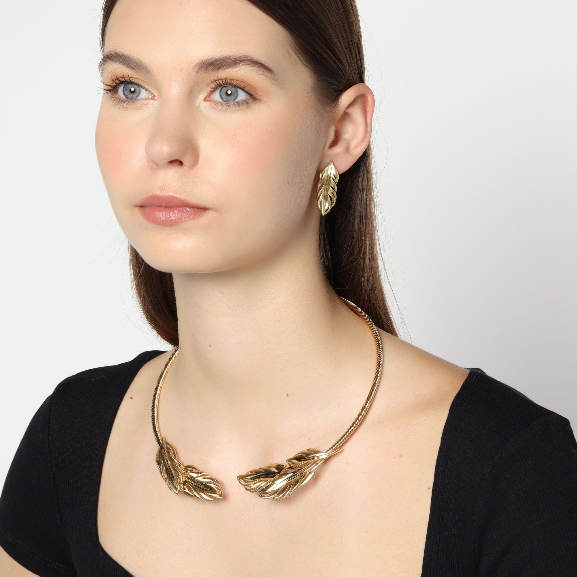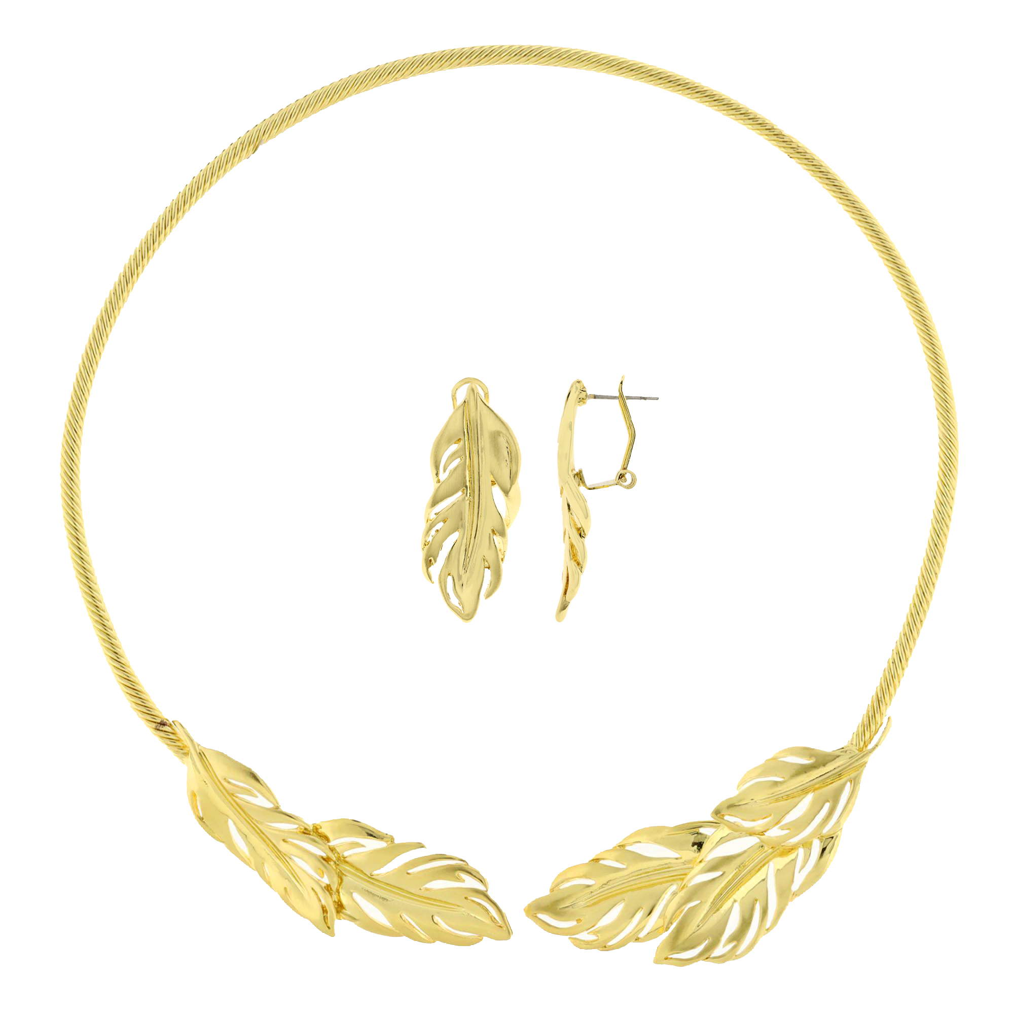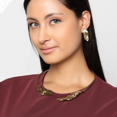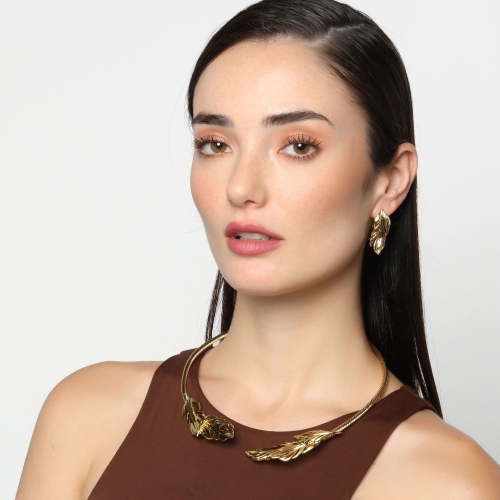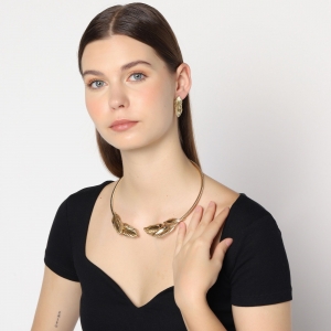 Exclusivo conjunto de collar y aretes en baño de oro amarillo de 18 quilates, gargantilla rígida con diseño estilo cordón y hojas doradas.