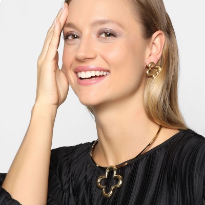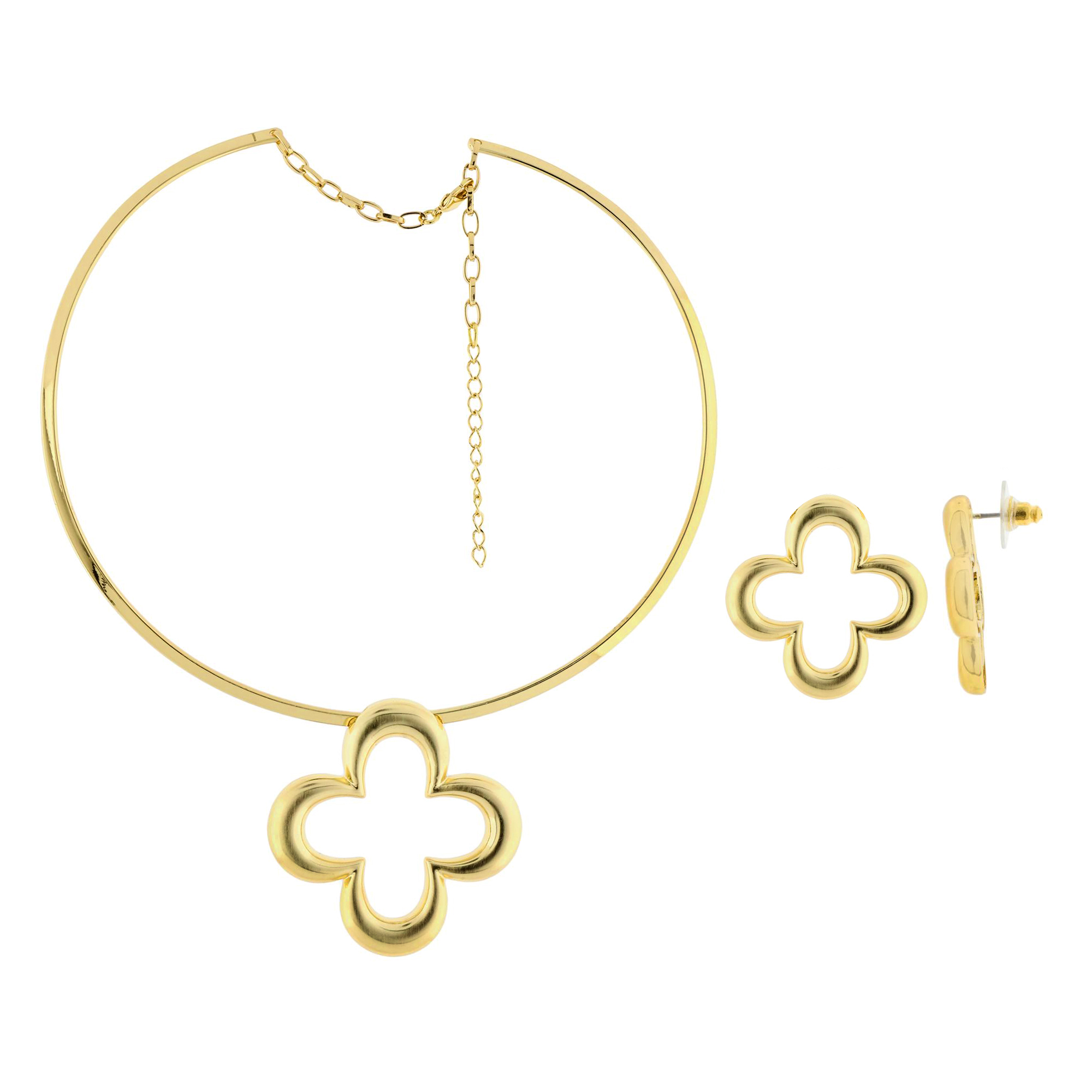 Exclusivo conjunto de collar y aretes en baño de oro amarillo de 18 quilates, gargantilla rígida con diseño estilo planchado y flores.