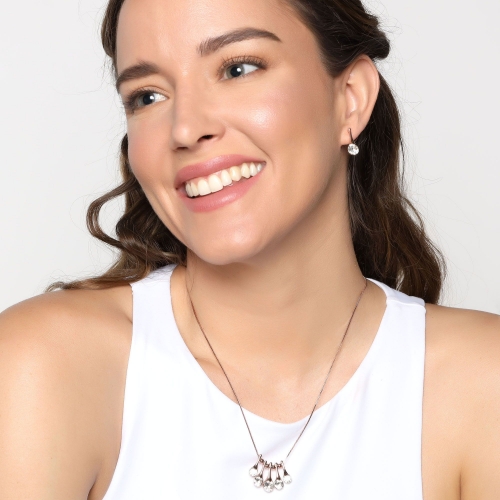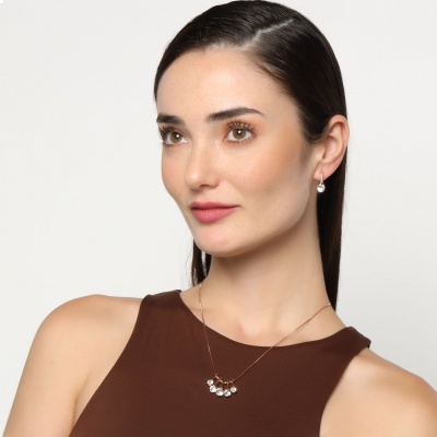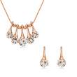 Original conjunto de collar aretes en baño de oro rosa de 18 quilates, diseño de gotas, con cuentas rosadas y cristales blancos corte brillante.