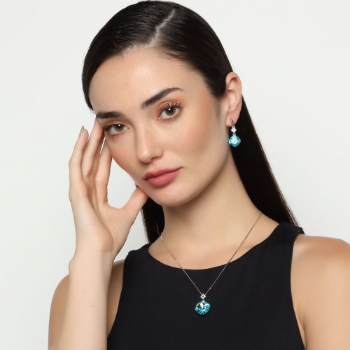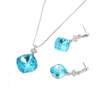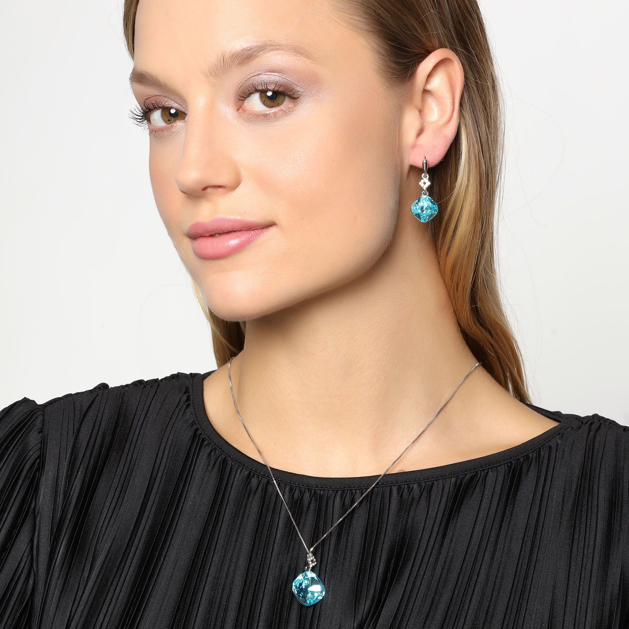 Fino conjunto de dije con cadena y aretes en baño de oro blanco de 18 quilates, diseño de rombos, con cristales azul cielo corte cushion e incrustaciones de cristales blancos.