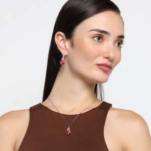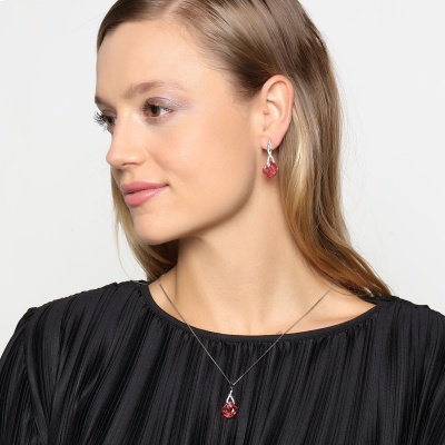 Bello conjunto de dije con cadena y aretes en baño de oro blanco de 18 quilates, diseño de rombos, con cristales rosa corte cushion e incrustaciones de cristales blancos.