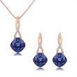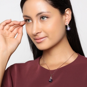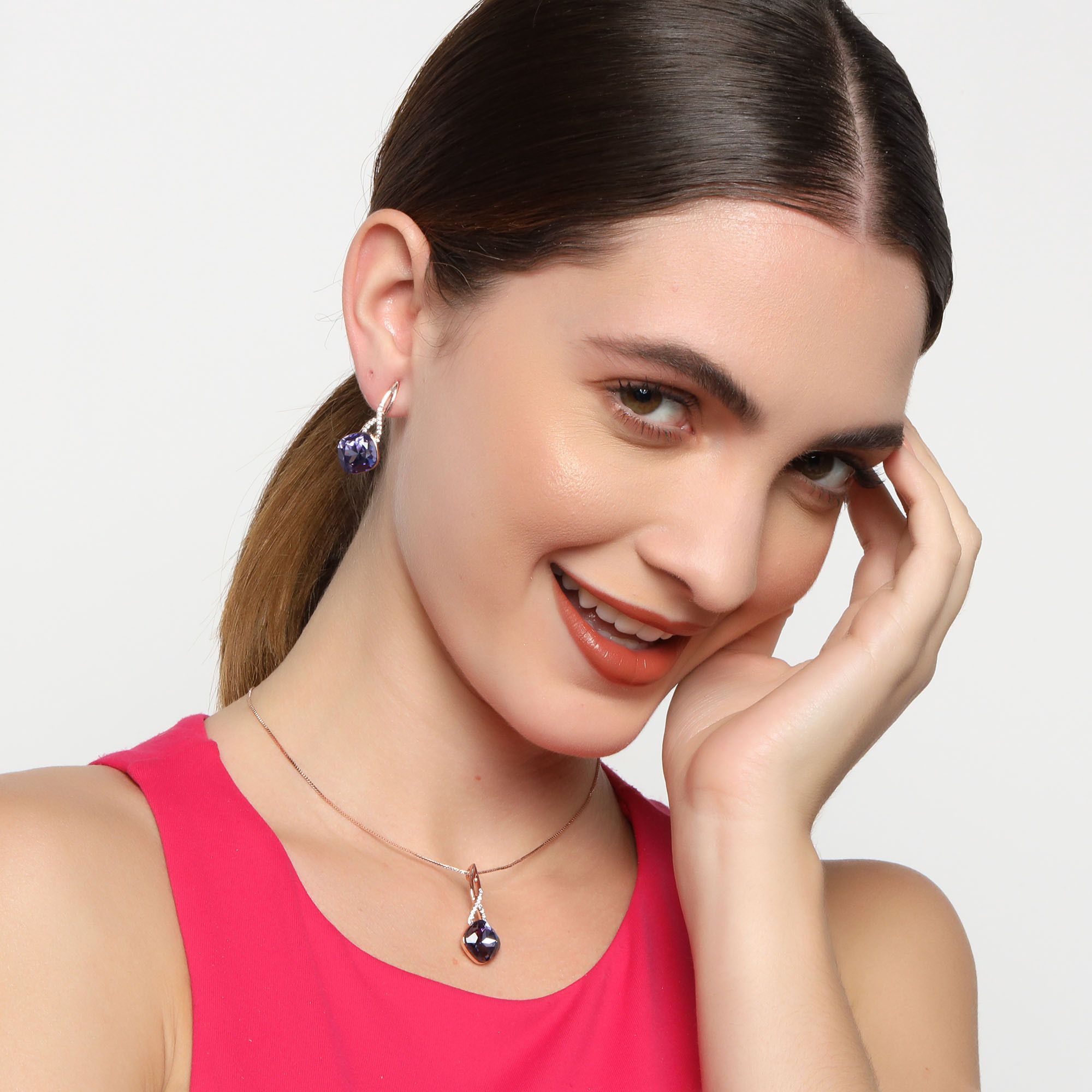 Bello conjunto de dije con cadena y aretes en baño de oro rosa de 18 quilates, diseño de rombos, con cristales morados corte cushion e incrustaciones de cristales blancos.