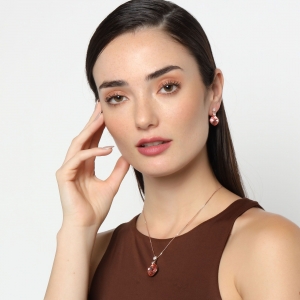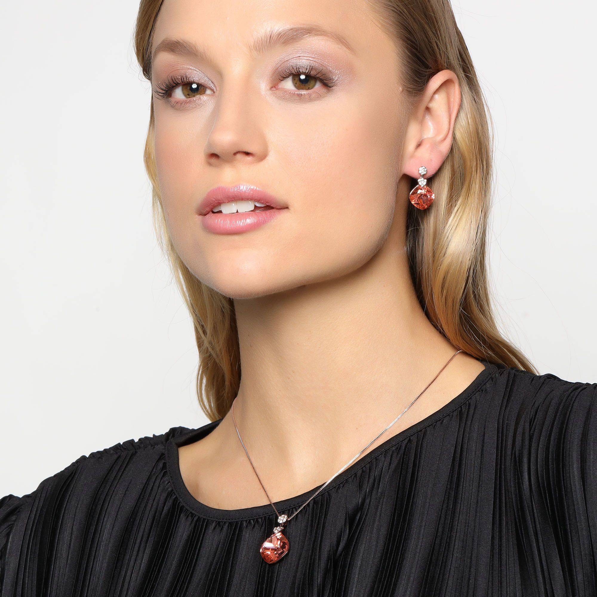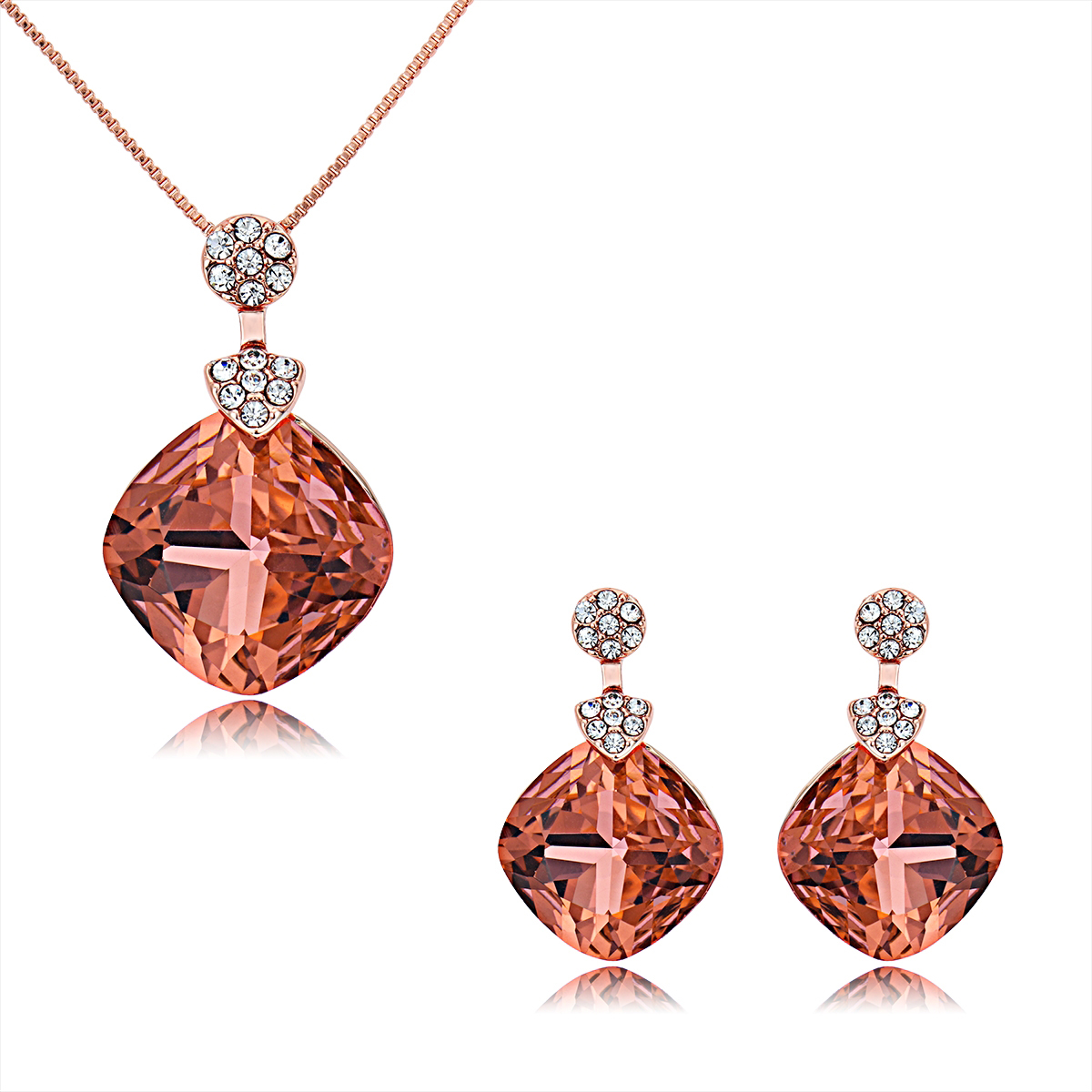 Hermoso conjunto de dije con cadena y aretes en baño de oro rosa de 18 quilates, diseño de rombos, cristales color durazno, corte cushion y pequeños triángulos con incrustaciones de cristales blancos.