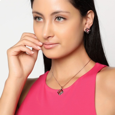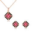 Lindo conjunto de dije con cadena y aretes en baño de oro rosa de 18 quilates, diseño de rombos, con cristales rosas corte princesa y esmaltado color negro.