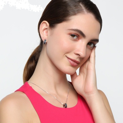 Elegante conjunto de dije con cadena y aretes en baño de oro blanco de 18 quilates, diseño convexo, con flor calada y chispas de cristales azul marino.