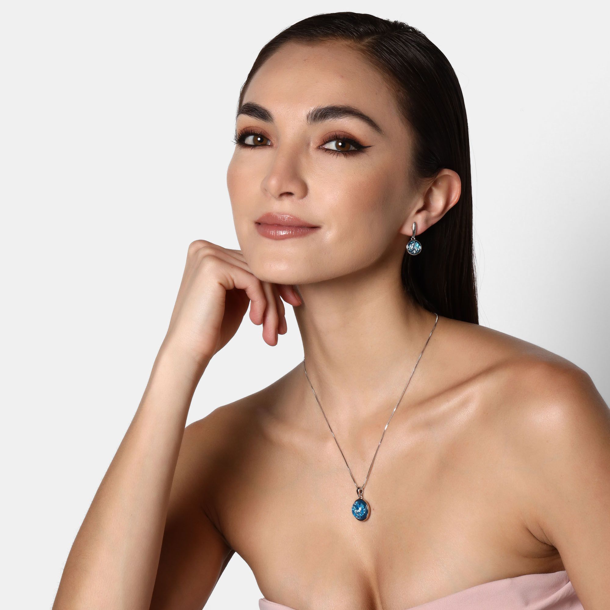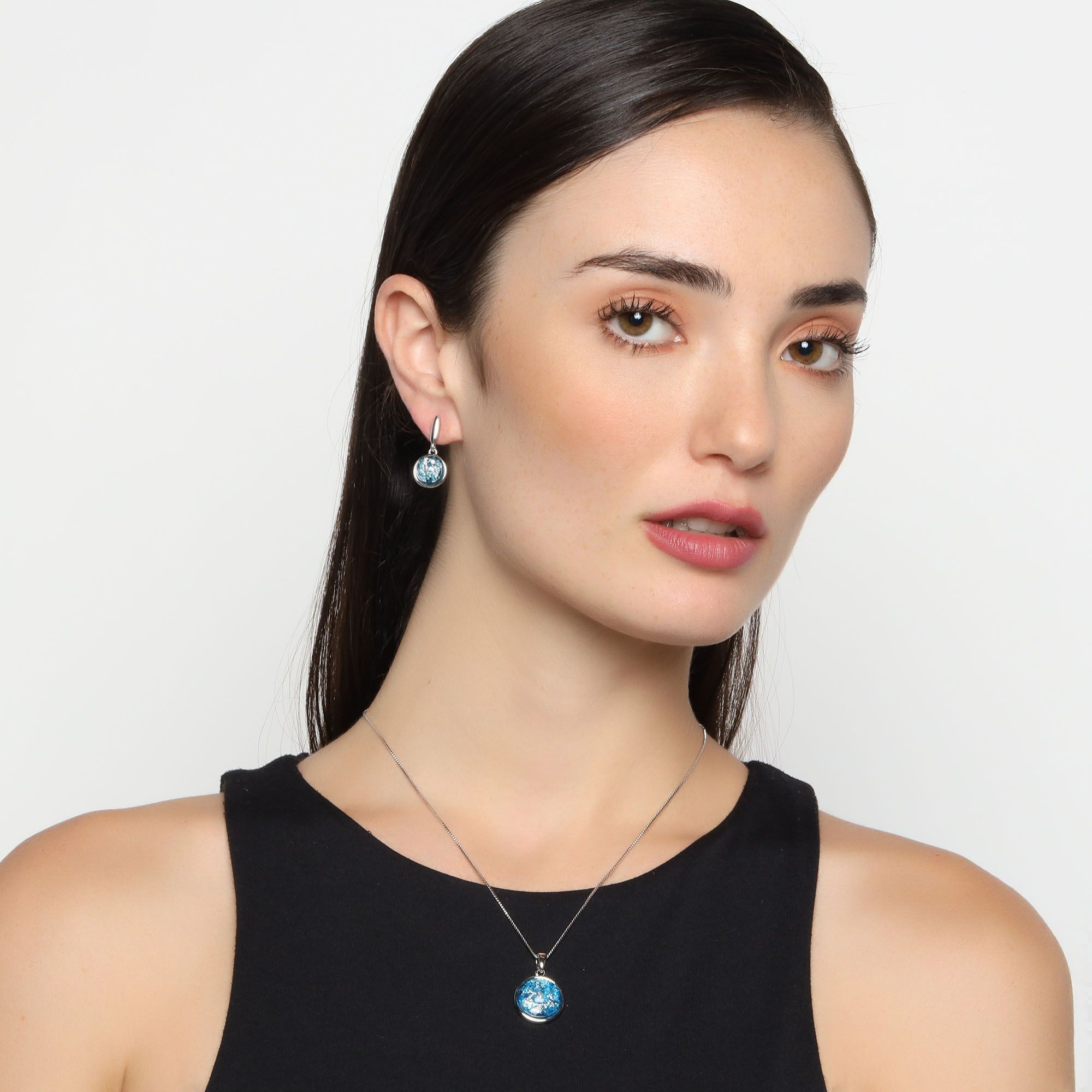 Bonito conjunto de dije y aretes en baño de oro blanco de 18 quilates, diseño de semiesfera encapsulada en color índigo y plateado.