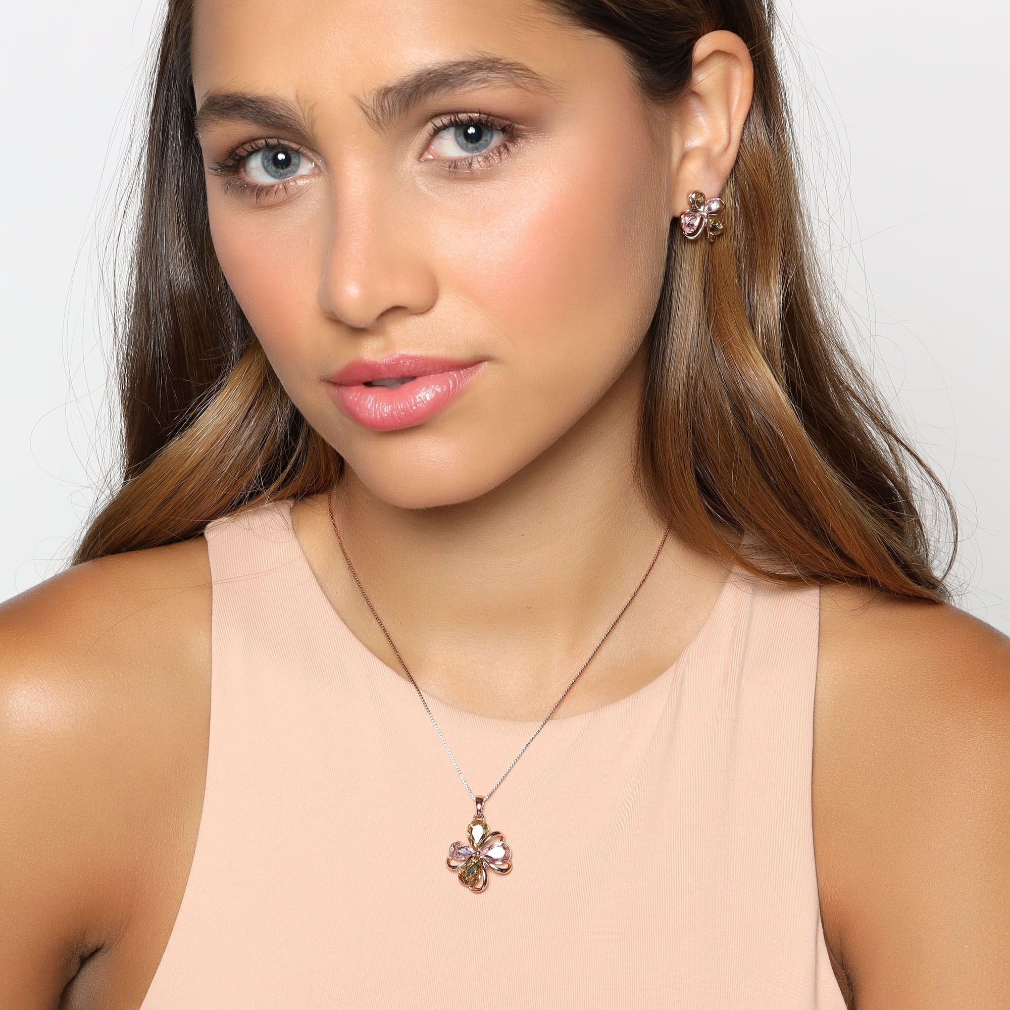 Exquisito conjunto de dije y aretes en baño de oro rosa de 18 quilates, diseño de flores estilizadas con cristales colores rosa y ámbar corte pera.