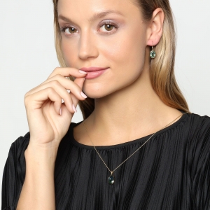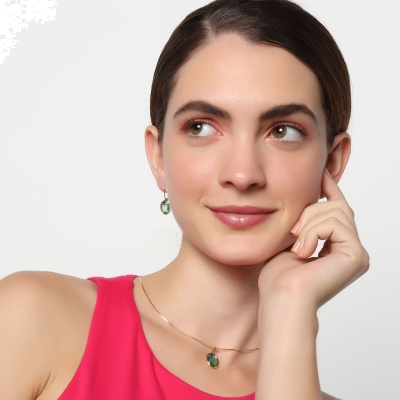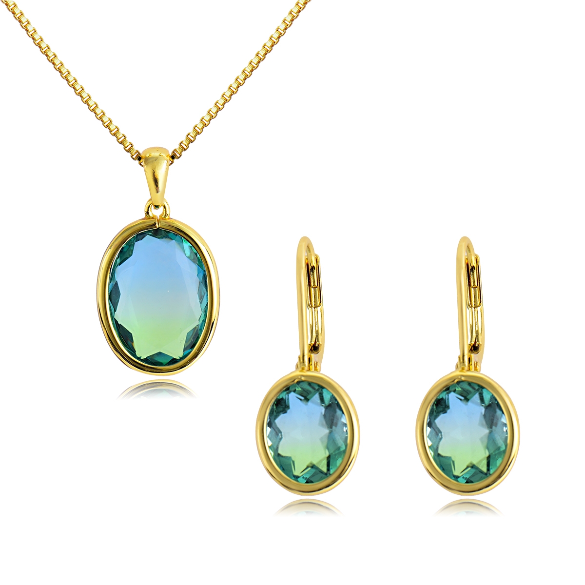 Colorido conjunto de dije y aretes en baño de oro amarillo de 18 quilates, diseño de óvalo con cristales bicolor en tonos verde y azul corte oval.