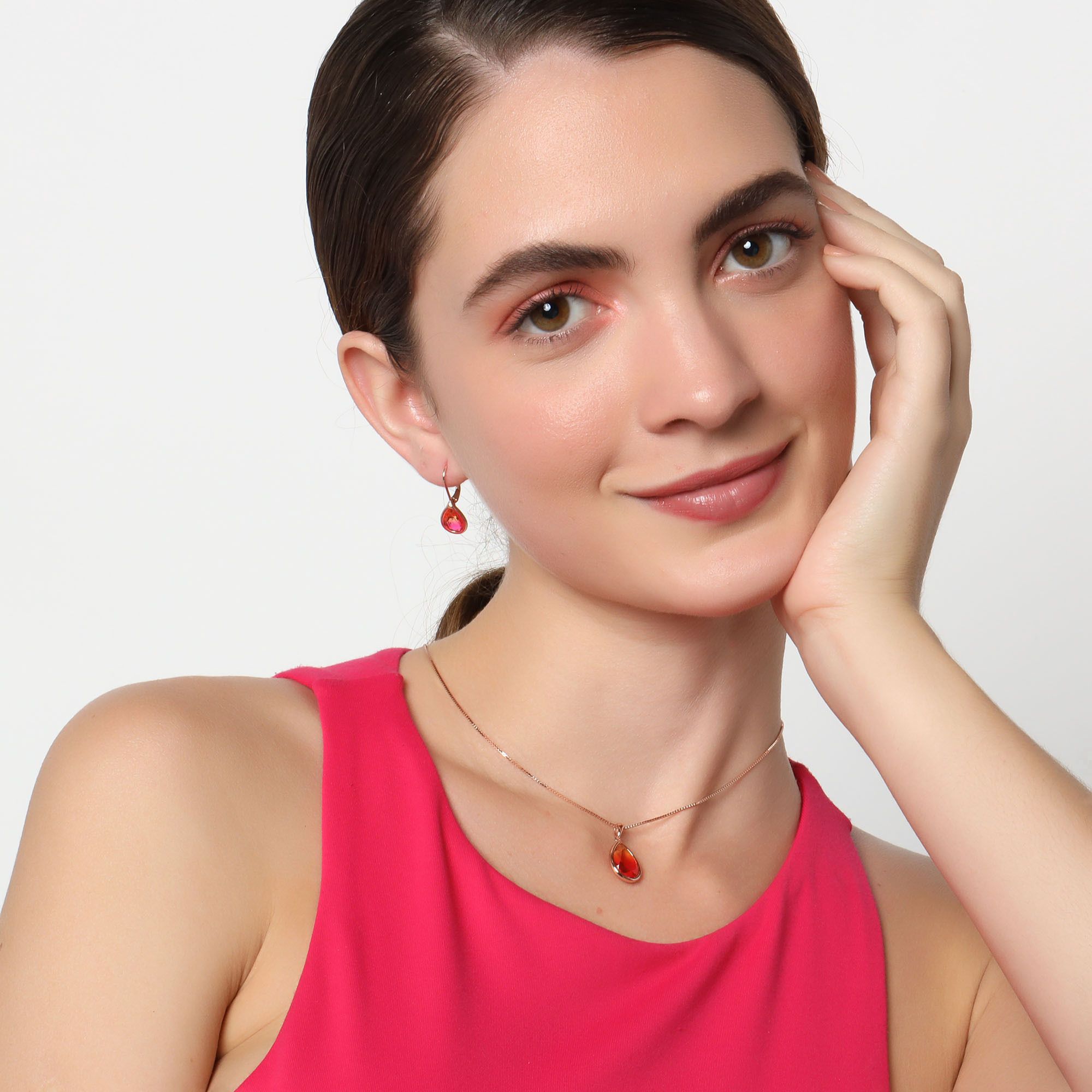 Colorido conjunto de dije y aretes en baño de oro rosa de 18 quilates, diseño de gota con cristales bicolor en tonos rosa y naranja corte pera.