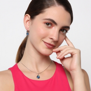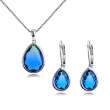 Colorido conjunto de dije y aretes en baño de oro blanco de 18 quilates, diseño de gota con cristales bicolor en tonos azul y verde corte pera.
