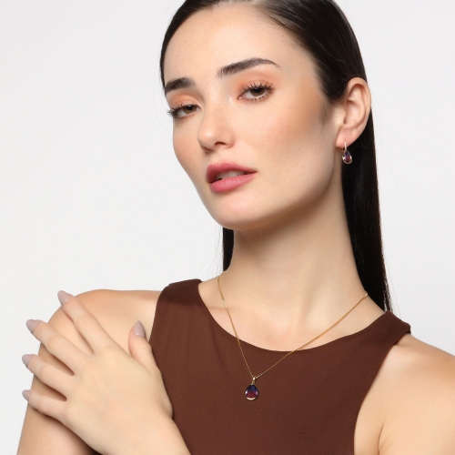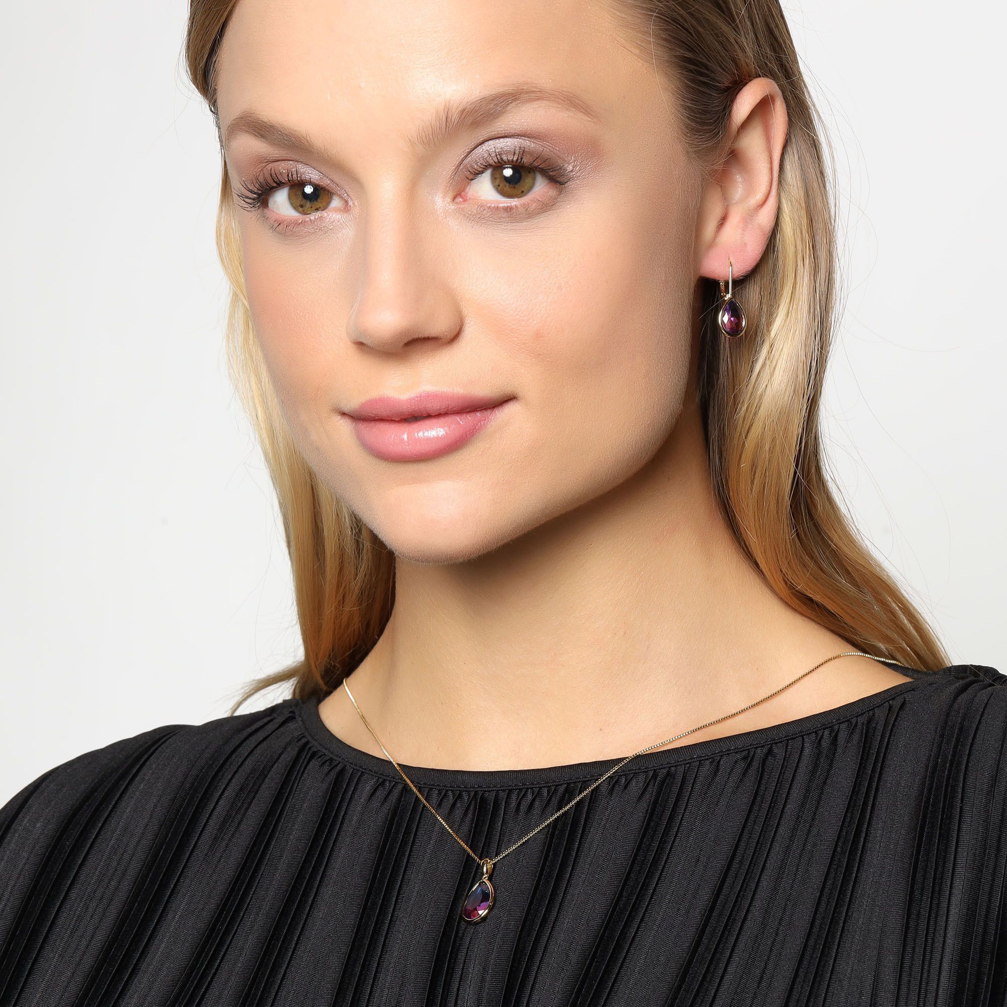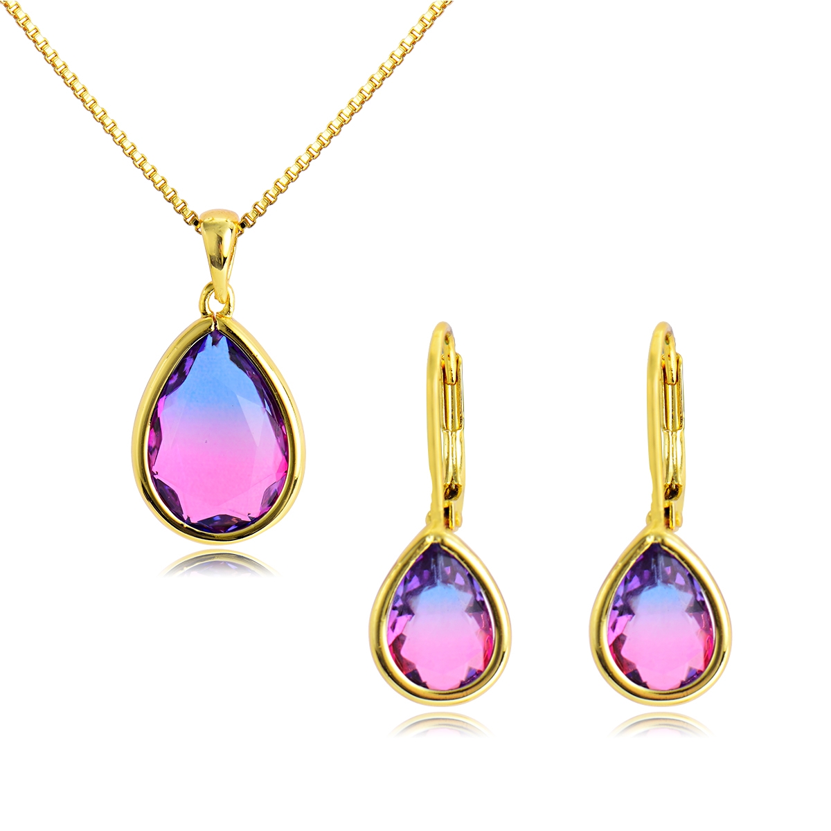 Colorido conjunto de dije y aretes en baño de oro amarillo de 18 quilates, diseño de gota con cristales bicolor en tonos rosa y morado corte pera.