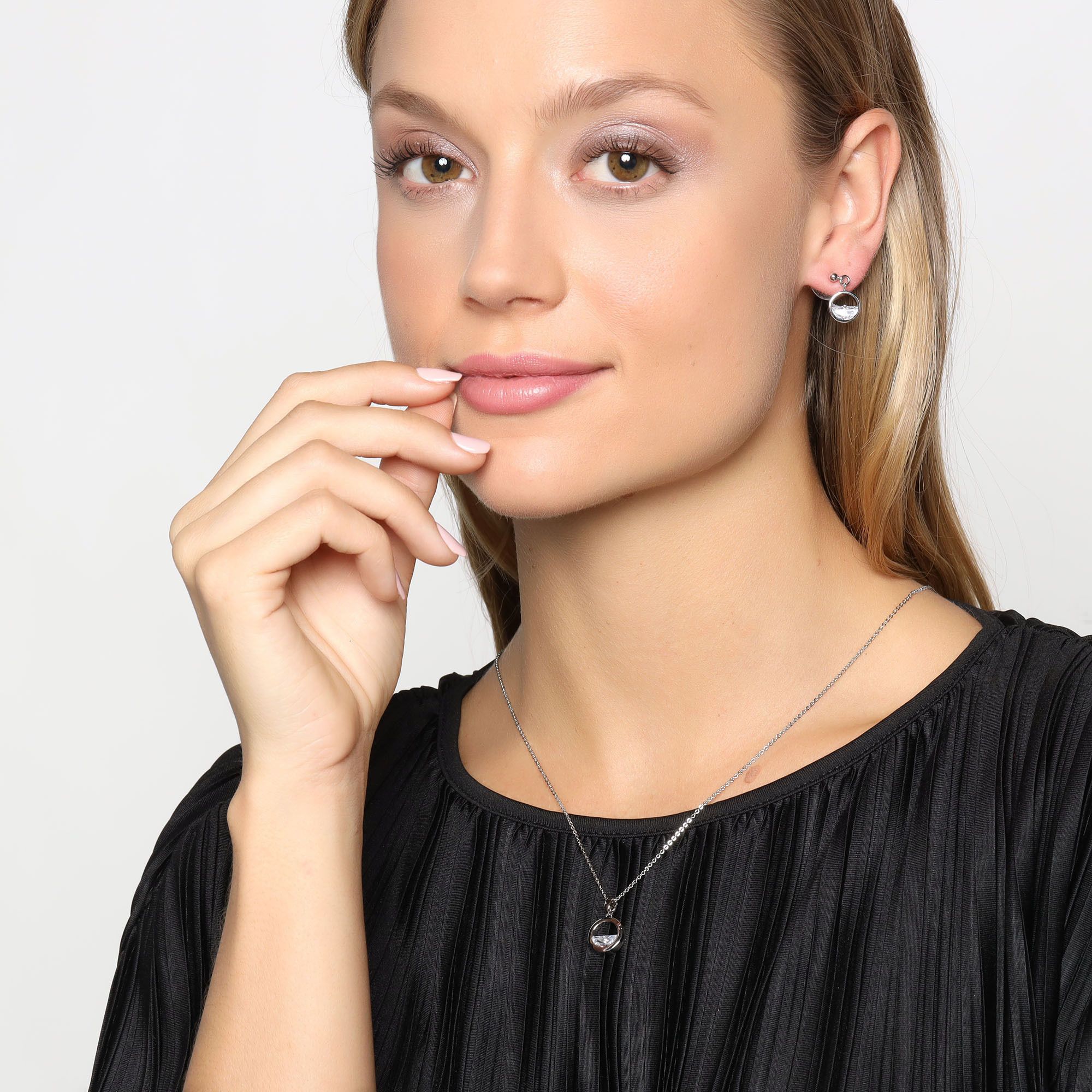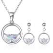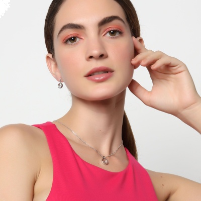 Original conjunto de dije y aretes en baño de oro blanco de 18 quilates, diseño de aro con cristales blancos corte media luna.
