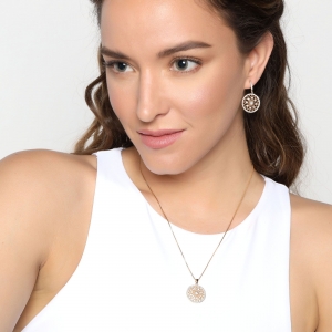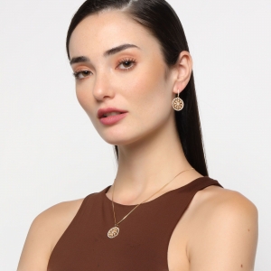 Bonito conjunto de dije y aretes en baño de oro amarillo de 18 quilates, diseño de flor estilo filigrana, con cristales blancos corte brillante y detalles en relieve.