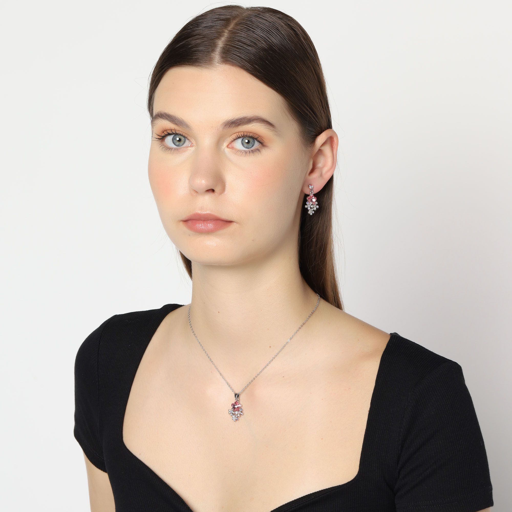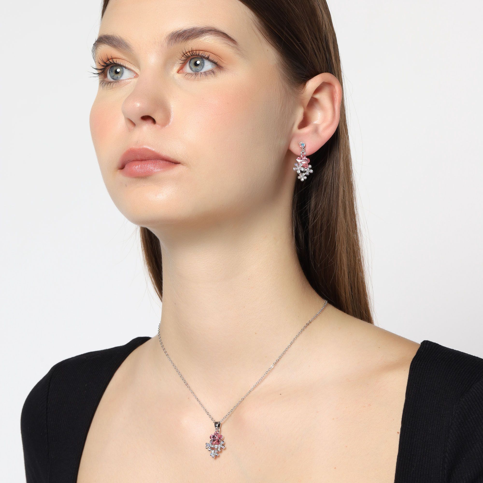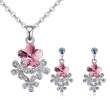 Lindo conjunto de dije y aretes en baño de oro blanco de 18 quilates, diseño de flores en cristal rosa y plateadas con incrustaciones de cristales tornasol corte brillante.