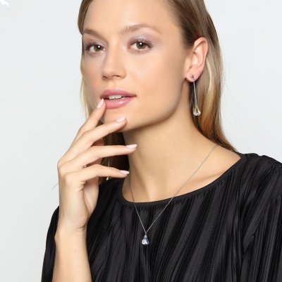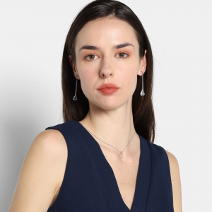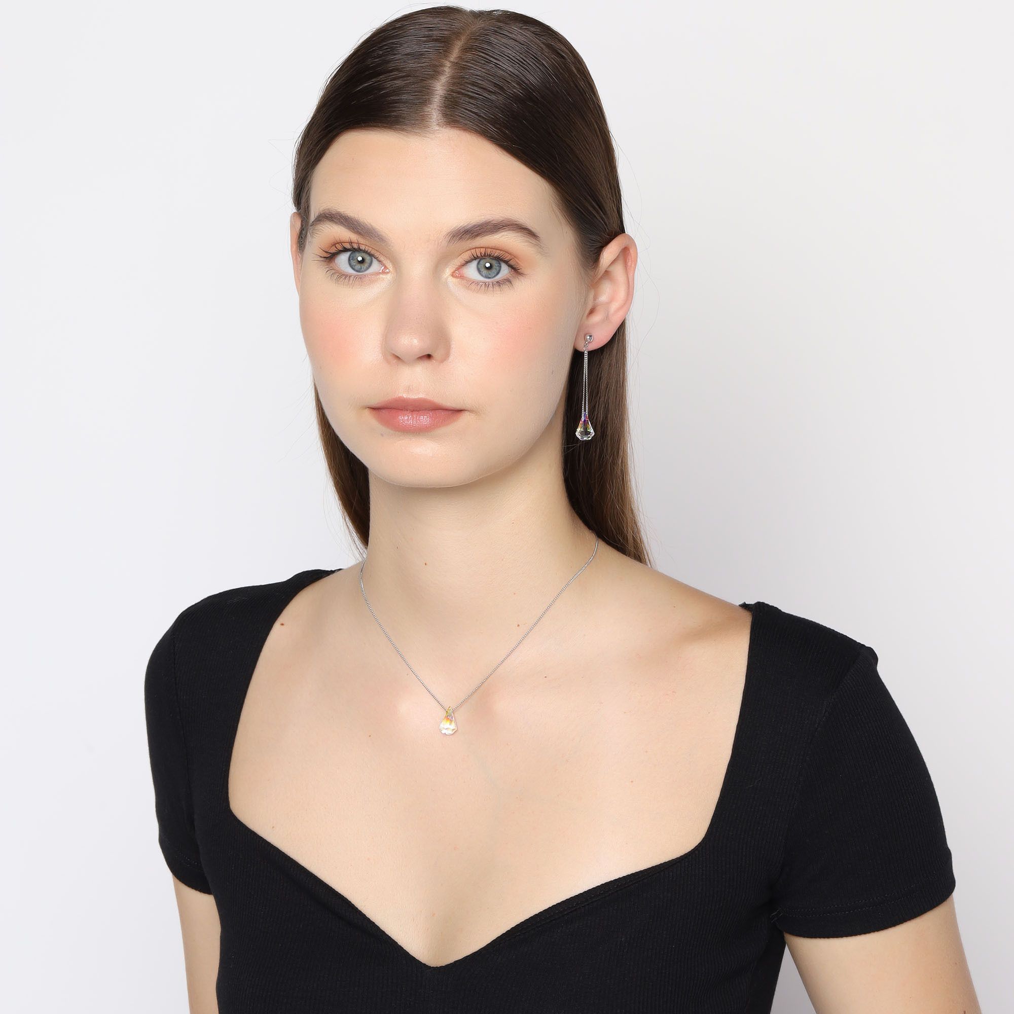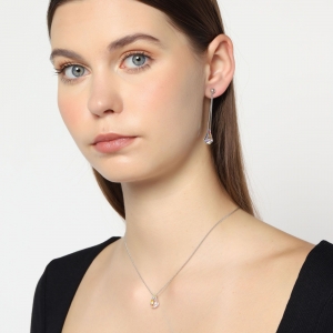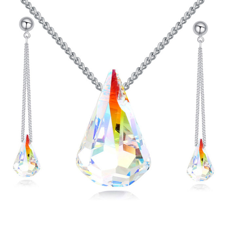 Moderno conjunto de dije y aretes en ba�o de oro blanco de 18 quilates, dise�o de gota en cristal aurora boreal corte pera.