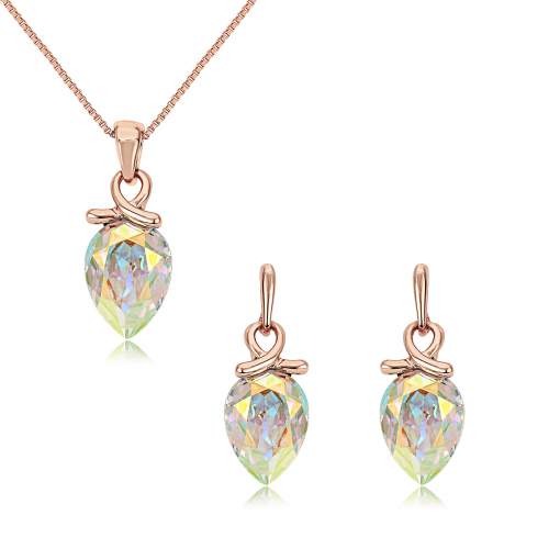 Bello conjunto de dije con cadena y aretes en baño de oro rosa de 18 quilates, diseño de gota caladas con cristales tornasol corte pera.