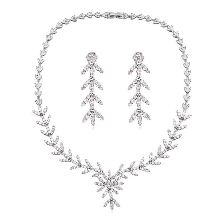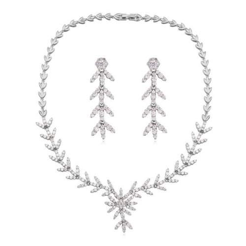 Exquisito y elegante conjunto de collar y pendientes en baño de oro blanco de 18 quilates, fino diseño de hojas con incrustaciones de cristales en color blanco.