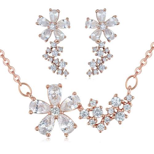 Exquisito conjunto de collar y aretes en baño de oro rosa de 18 quilates, diseño de flores con incrustaciones de cristales en color blanco.