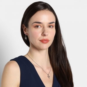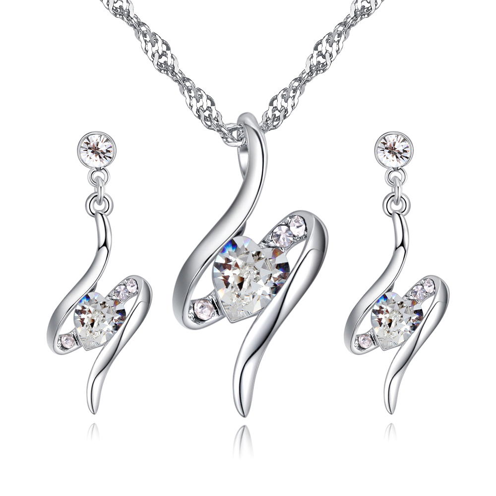 Bonito conjunto de dije y aretes en ba�o de oro blanco de 18 quilates, fino dise�o con cristal al centro en forma de coraz�n e incrustaciones de cristales en color blanco.