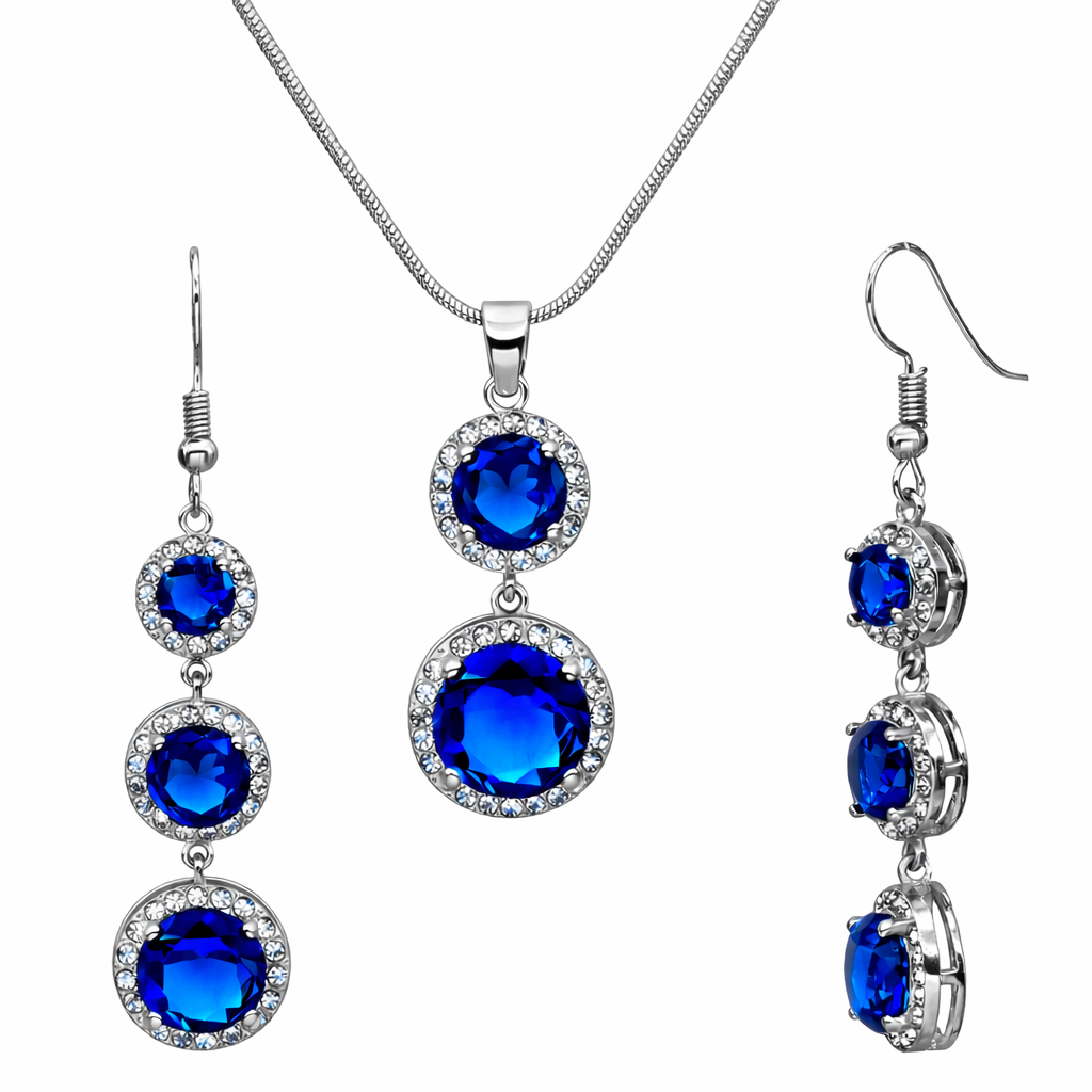 Exquisito conjunto de collar y pendientes en baño de oro blanco de 18 quilates, diseño de círculos con cristales en color azul rey e incrustaciones de cristales blancos al rededor.