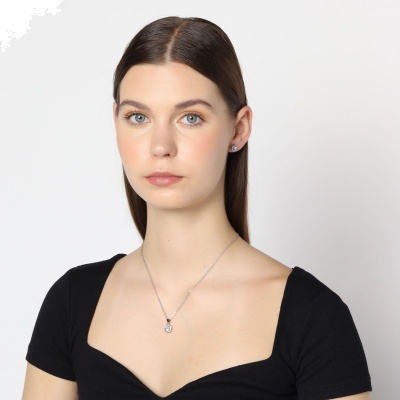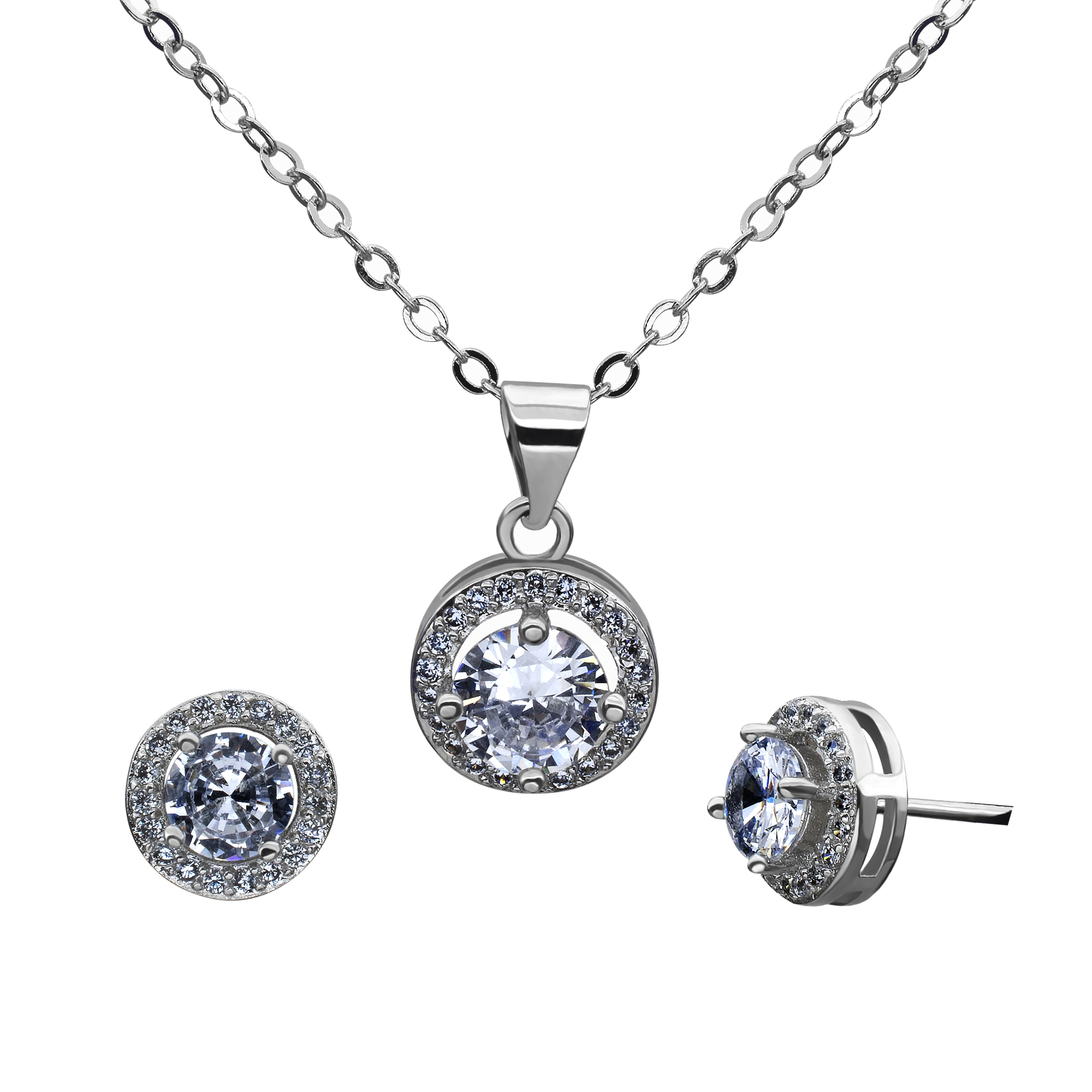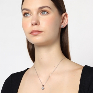 Precioso conjunto de dije y aretes en baño de oro blanco de 18 quilates, diseño de circulo con cristales blancos y cristales incrustados al rededor en color blanco.