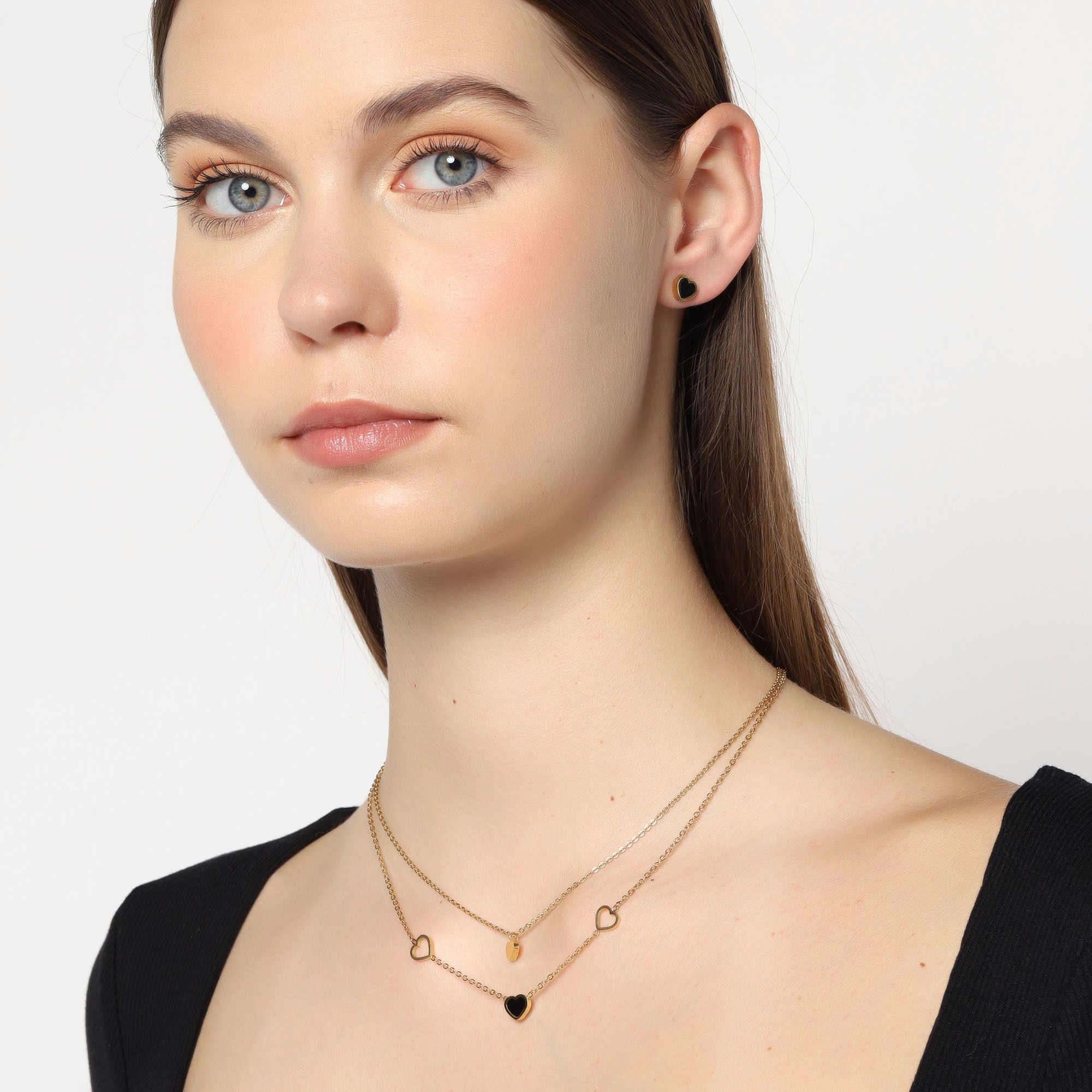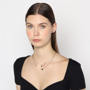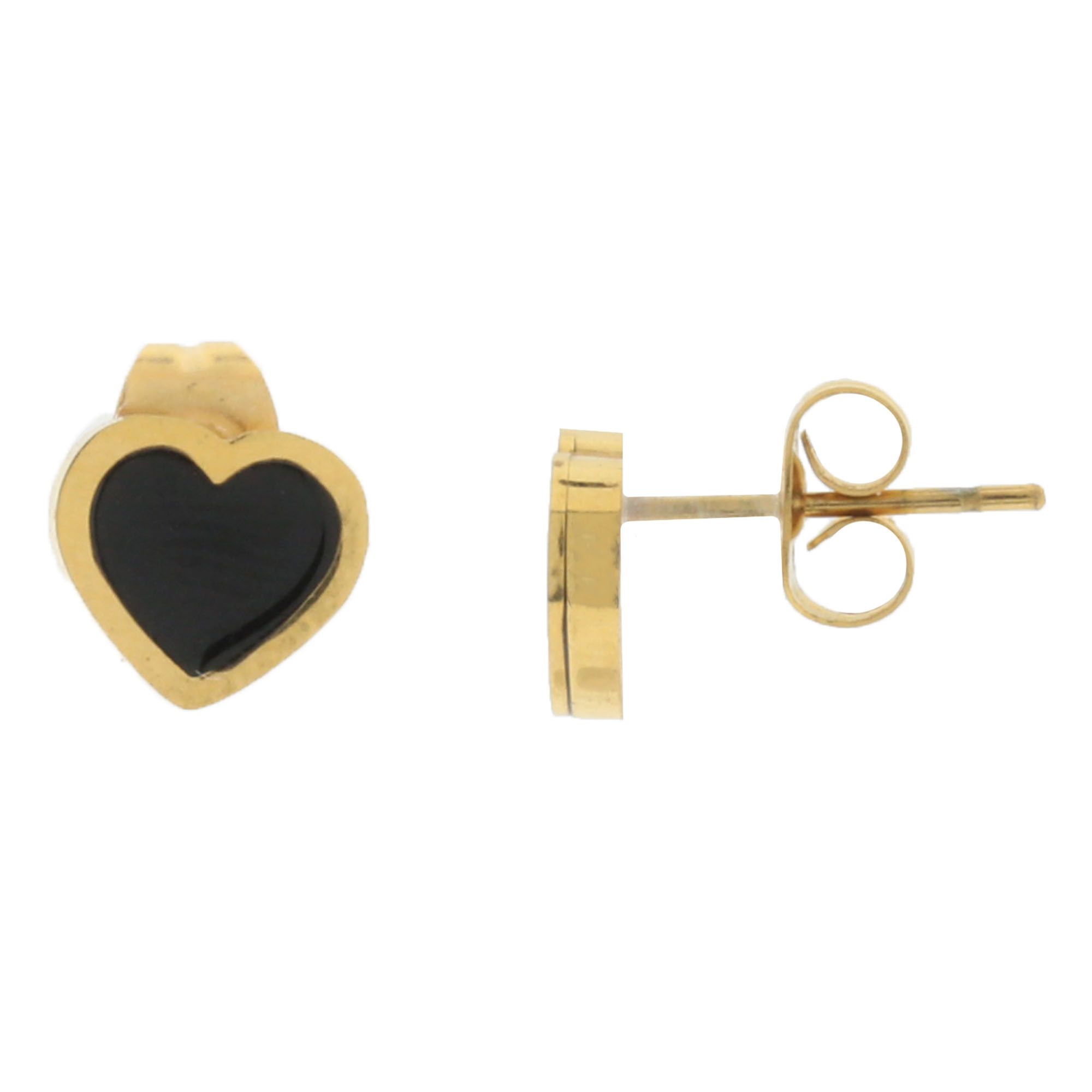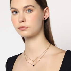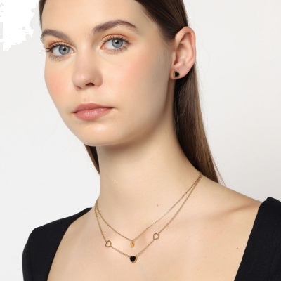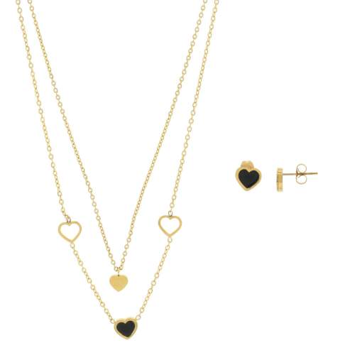 Precioso conjunto de collar y aretes en acero de titanio color amarillo, diseño de corazones con aplicación en color negro.