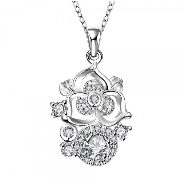 Exclusivo dije con cadena en Plata Ley 925, diseño de flor, con cristal blanco corte brillante e incrustaciones de cristales blancos.