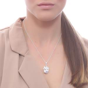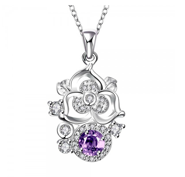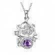 Exclusivo dije con cadena en Plata Ley 925, diseño de flor, con cristal morado corte brillante e incrustaciones de cristales blancos.