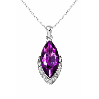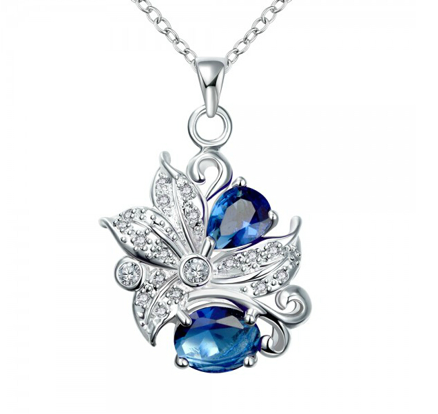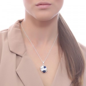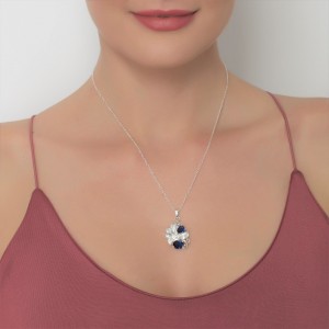 Original dije con cadena en Plata Ley 925, diseño de pétalos, con cristales azul índigo corte pera y corte oval e incrustaciones de cristales blancos.